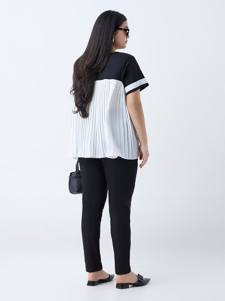 Crafted in a classic black hue, this stretchable top by Gia features delicate pearlescent detailing along the spread collar for an elegant touch. Designed in a soft fabric with full sleeves, it offers a refined silhouette that transitions seamlessly from workwear to evening outings.