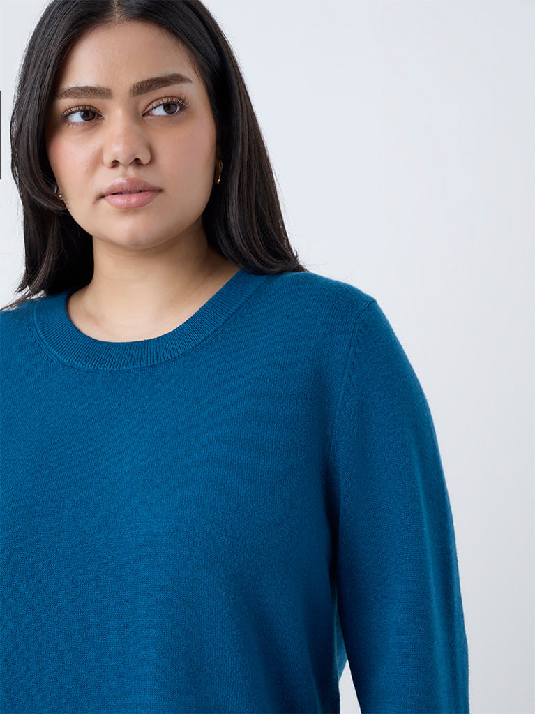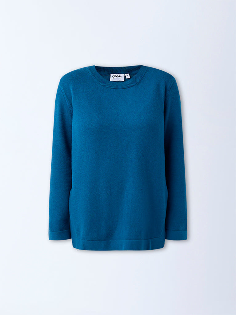 This blue solid sweater by Gia is crafted from a breathable fabric for lasting comfort. It features a refined knit texture with a ribbed round neck and full sleeves, while the side slits add a touch of ease and movement to the silhouette.