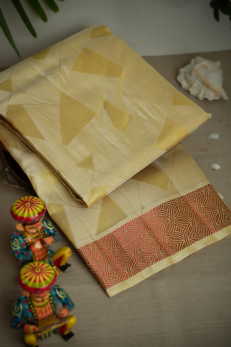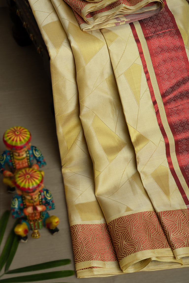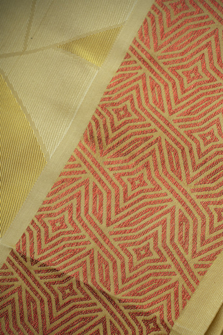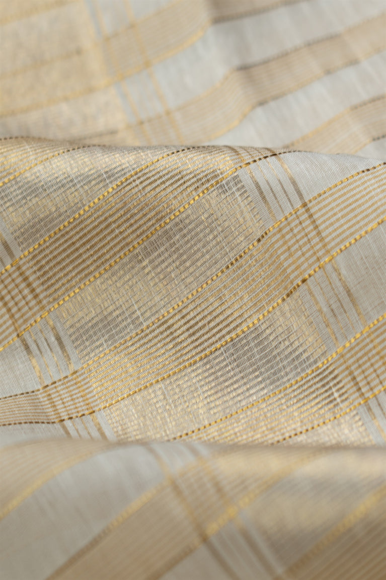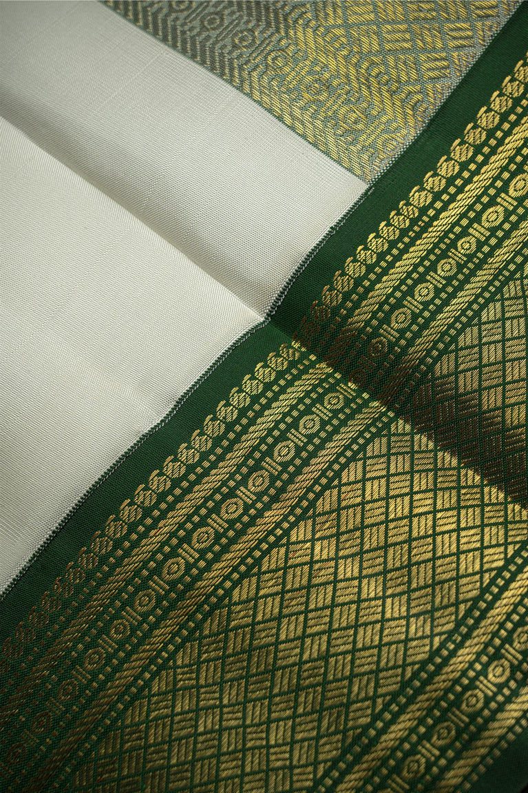 Crafted with love, this Kancheepuram Silk Stripes Off White Dhoti is a timeless piece. Adorned with resplendent stripes gracefully adorning its body, this masterpiece weaves a tale of tradition and magnificence. Each intricate pattern, meticulously crafted, mirrors the brilliance of a thousand stars. The ethereal off-white hue casts a spell of purity and grace. Enhanced by the majestic Diamonds Contrast Border, this dhoti embodies the essence of grandeur and opulence.
