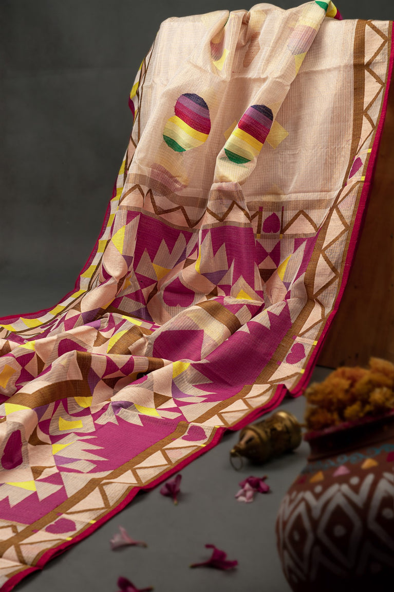 Mandir Dark Cream & Dark Pink Ikat Ikat Saree