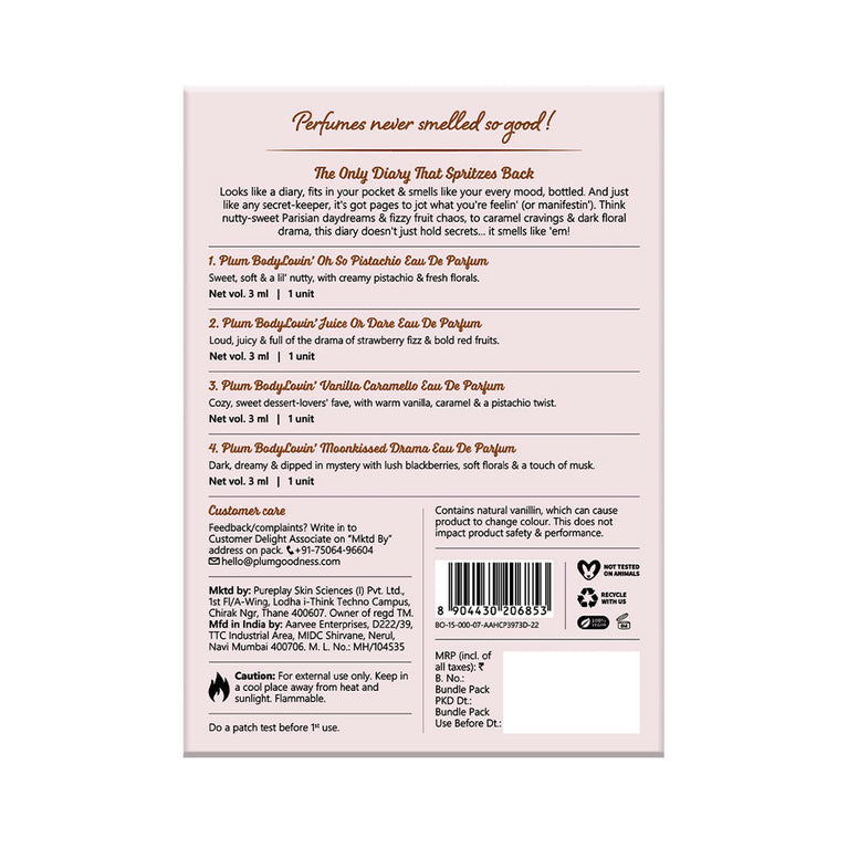 The Only Diary That Spritzes BackLooks like a diary, fits in your pocket & smells like your every mood, bottled. And just like any secret-keeper, it's got pages to jot what you're feelin' (or manifestin'). Think nutty-sweet Parisian daydreams & fizzy fruit chaos, to caramel cravings & dark floral drama, this diary doesn't just hold secrets... it smells like 'em!