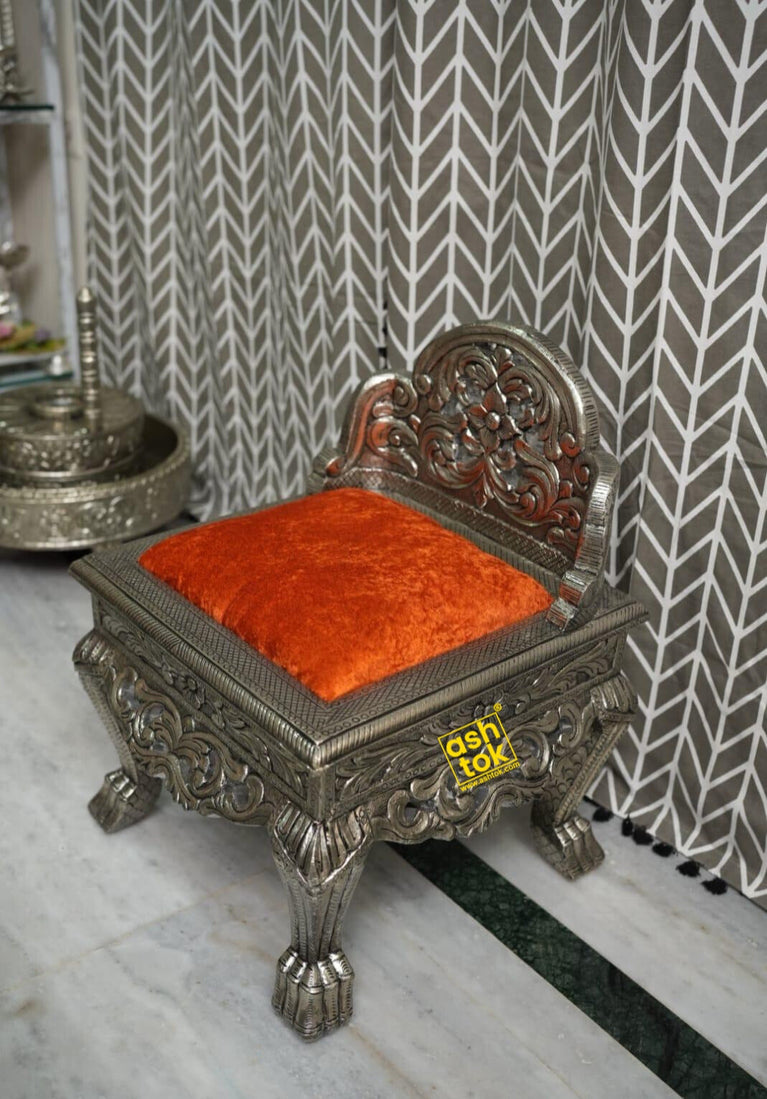 Add timeless elegance to your pooja and ceremonial décor with the Ashtok handcrafted German silver chowki. Designed with intricate traditional carvings and a luxurious velvet cushioned seat, this chowki perfectly blends craftsmanship, comfort, and heritage.