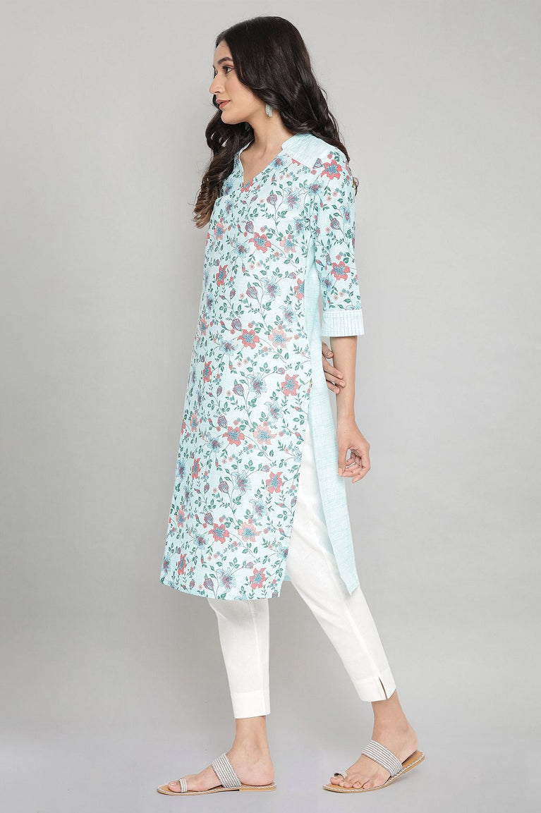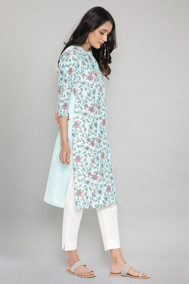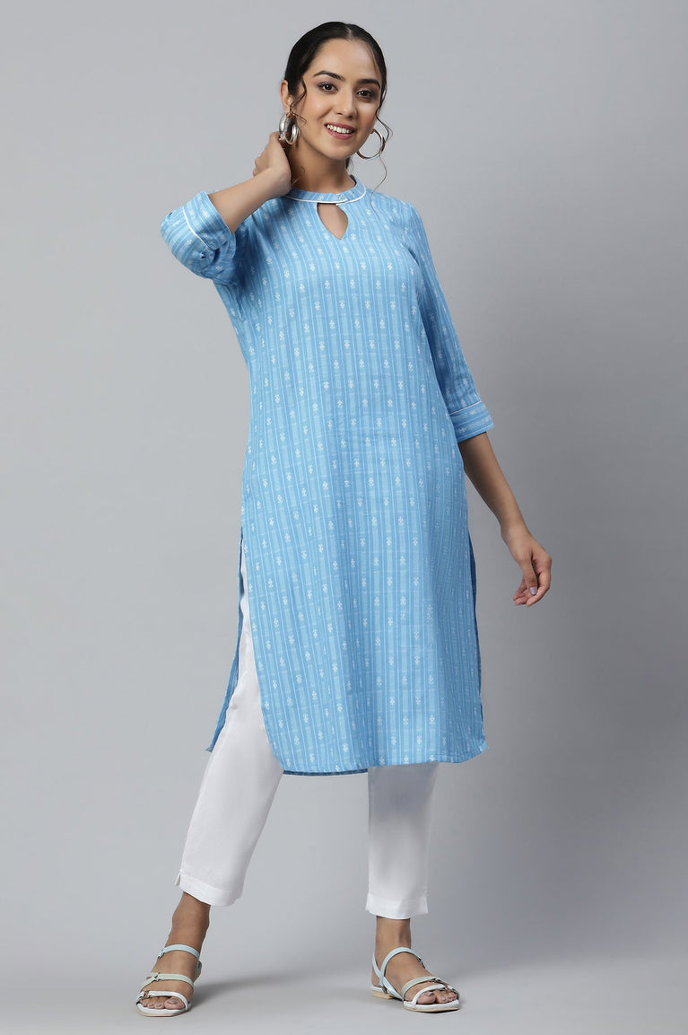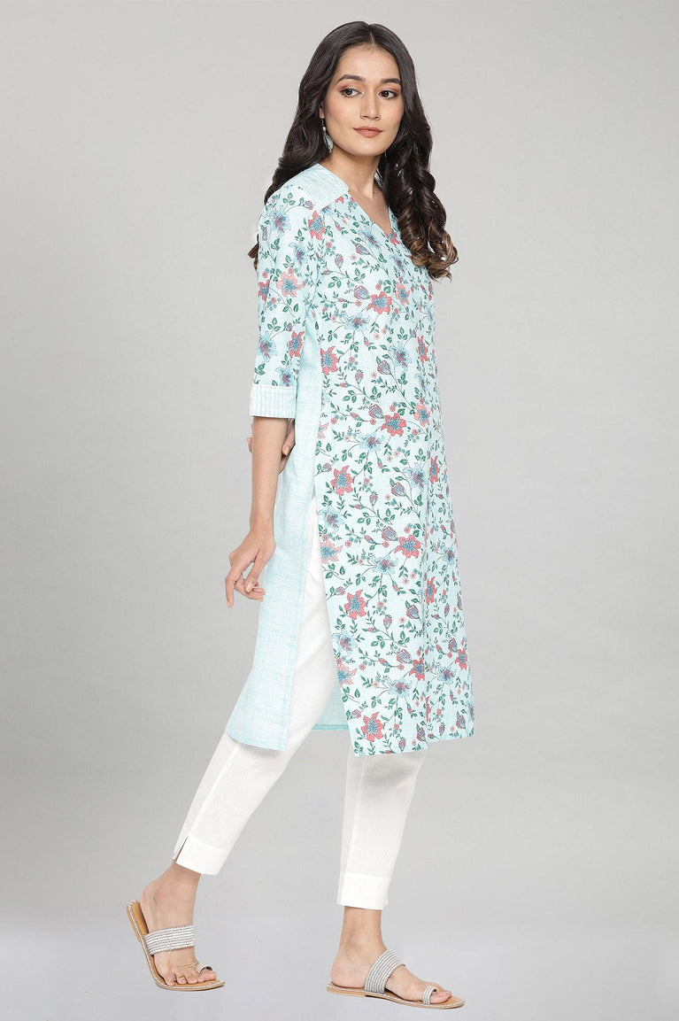 Simple yet chic! This floral print ocean wave kurta in round neck with button placket kurta has staright silhouette, side slits and three-quarter sleeves. Amph up your casual wardrobe with this pretty and comfortable kurta. You can style it for a casual day out, at office or while traveling.