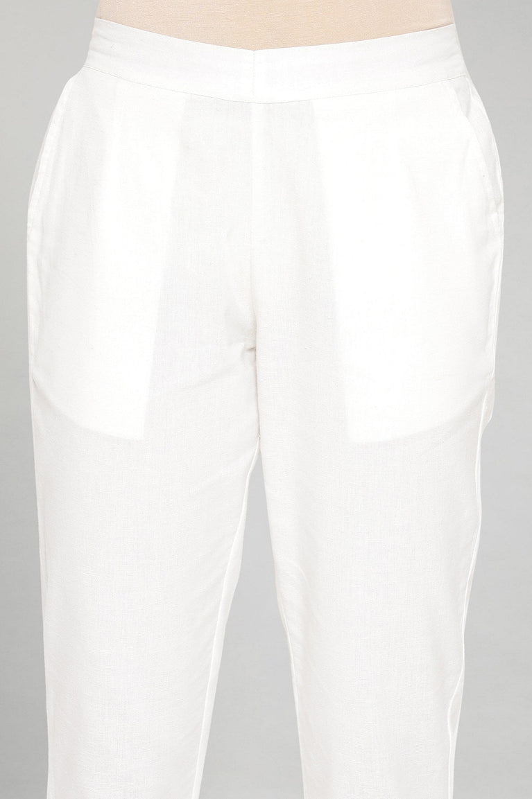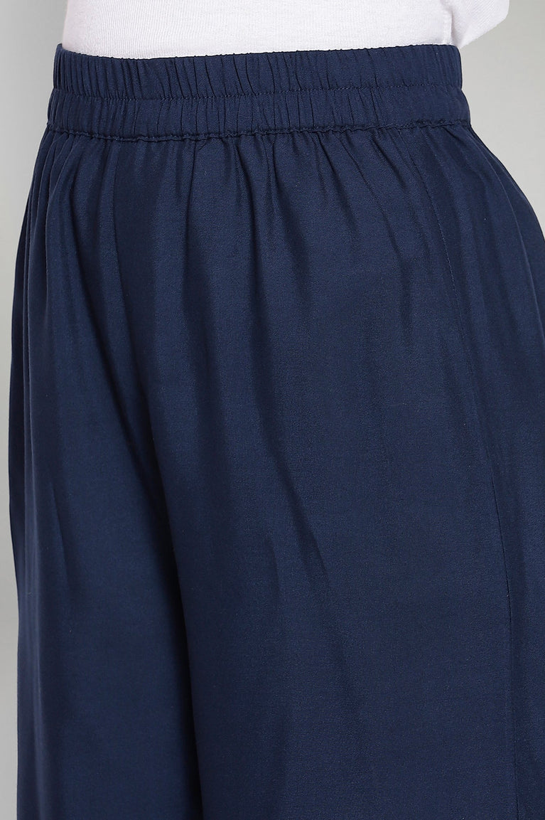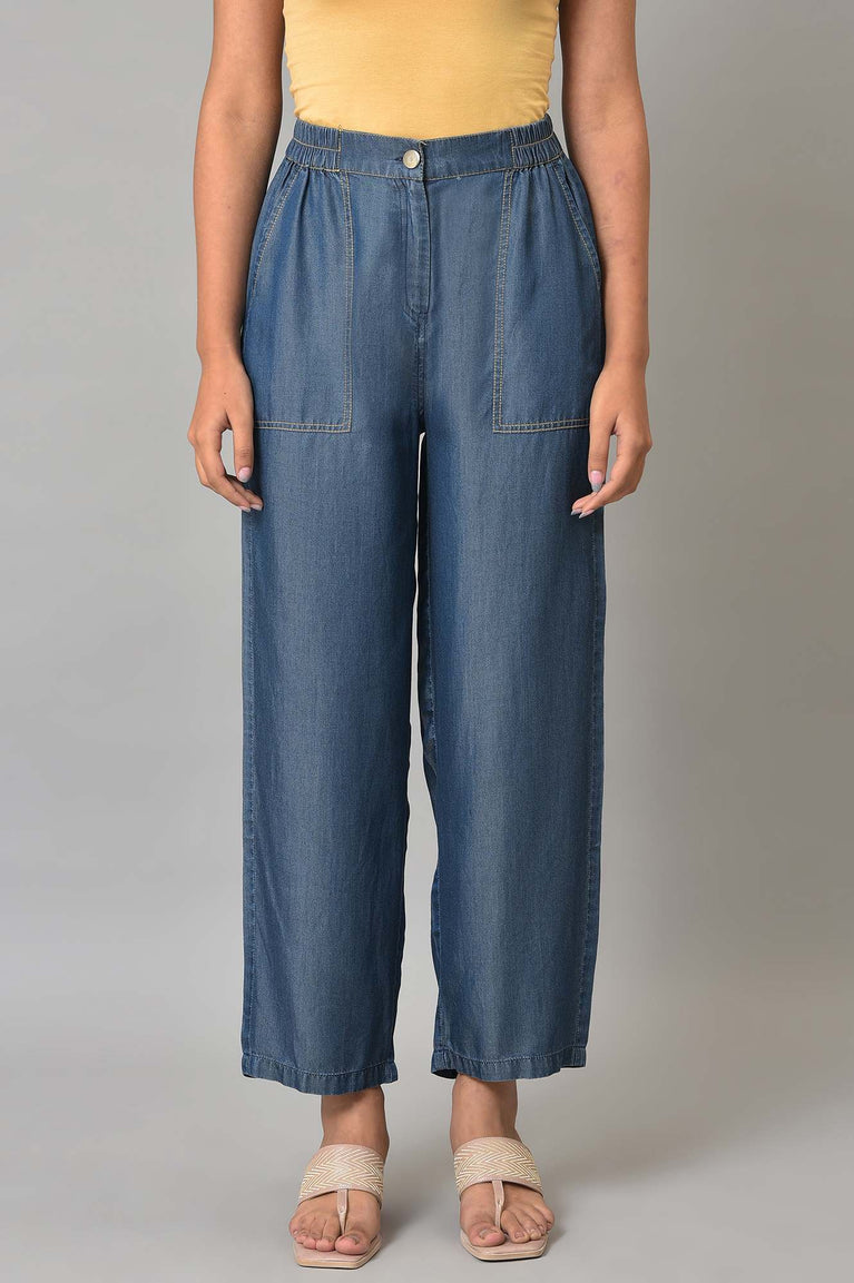Denim Narrow Pants In Ankle Length Having Mid-Rise And Partially Elasticated Waistband. This Solid Trouser Has A Front Fly With Zipper And Button Closure Along With Front Patch Pockets For A Smart Look.