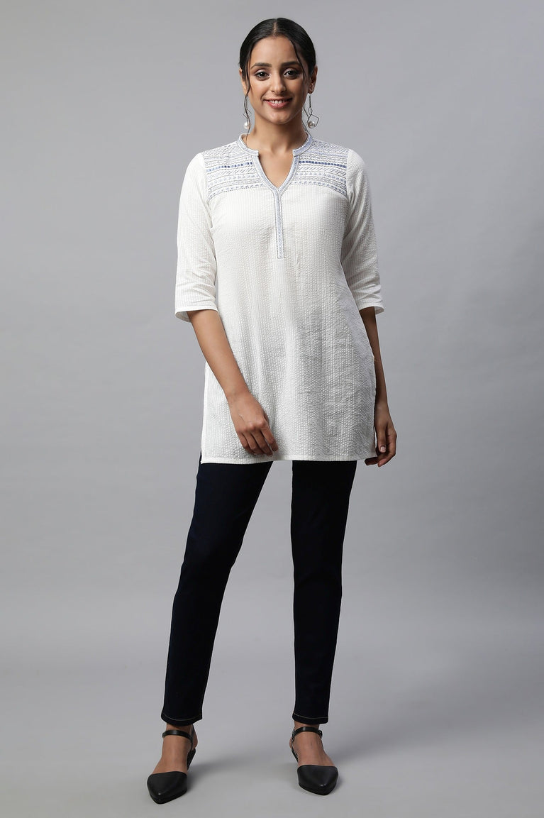 This Denim Kurta Features A Delicate Dori Embroidery In Pristine White Thread, A Mandarin Collar And Moon Snap Buttons, Making It A Perfect Mix Of Comfort, Beauty And Relaxed Sophistication. Pair It With Our Denim Trousers To Elevate Your Look.