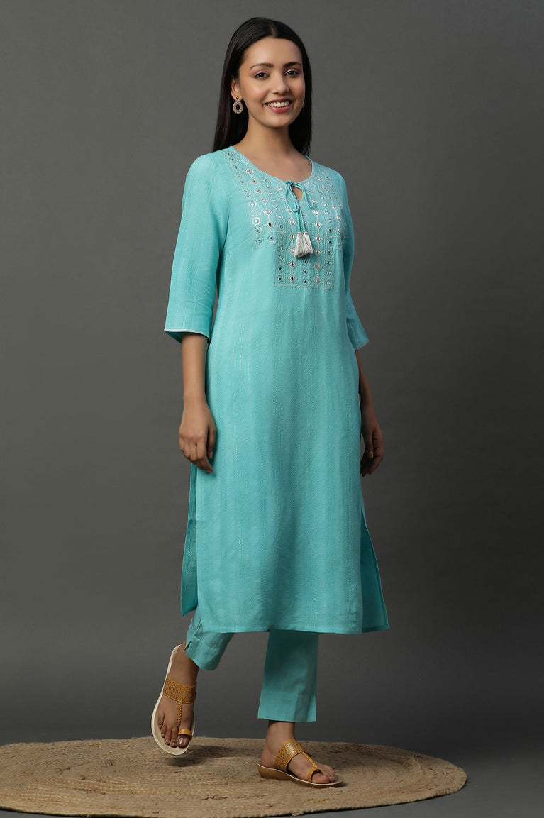 Blue round neck kurta having three-quarter sleeves and thread embroidery at front. Paired with solid blue trousers and dupatta.