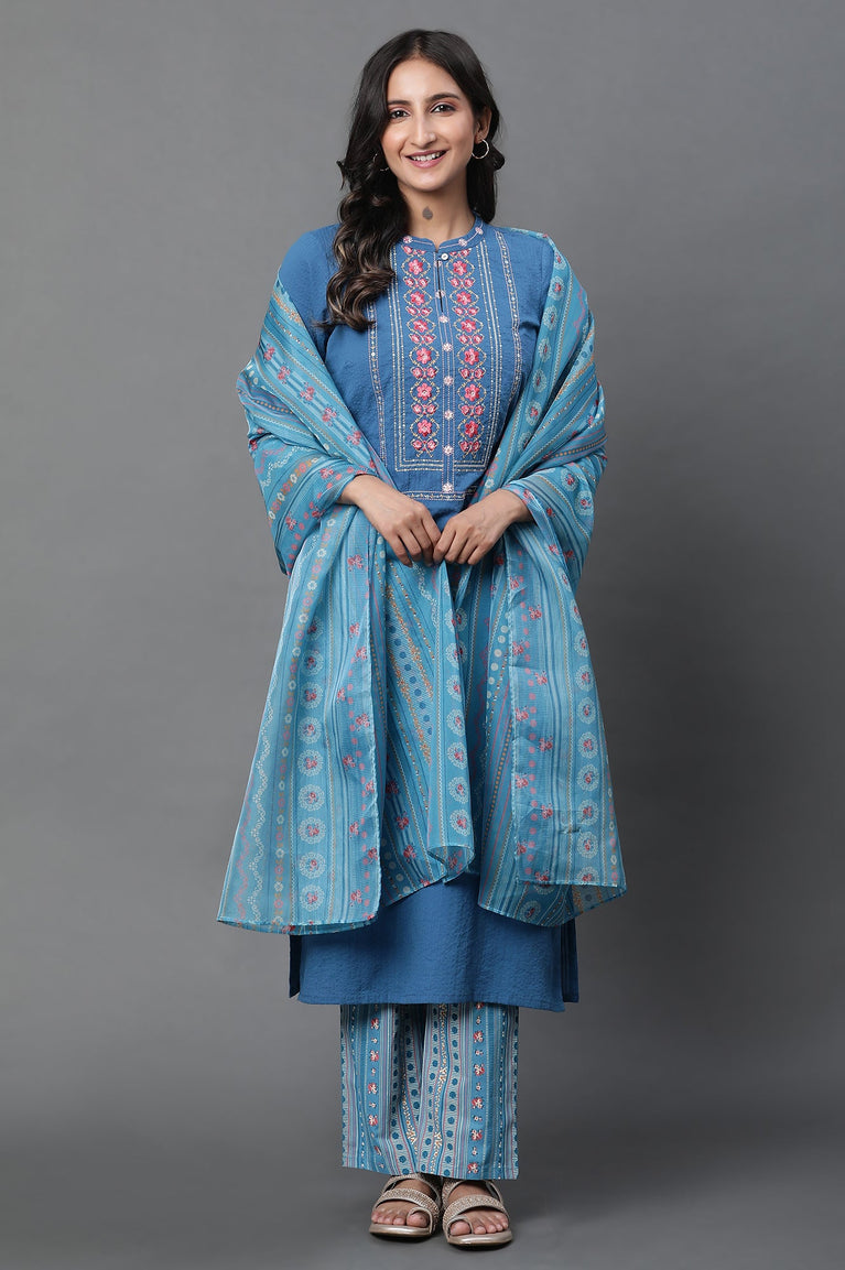 Blue Yarn Dyed Cotton Blend Straight Kurta and Palazzo Set