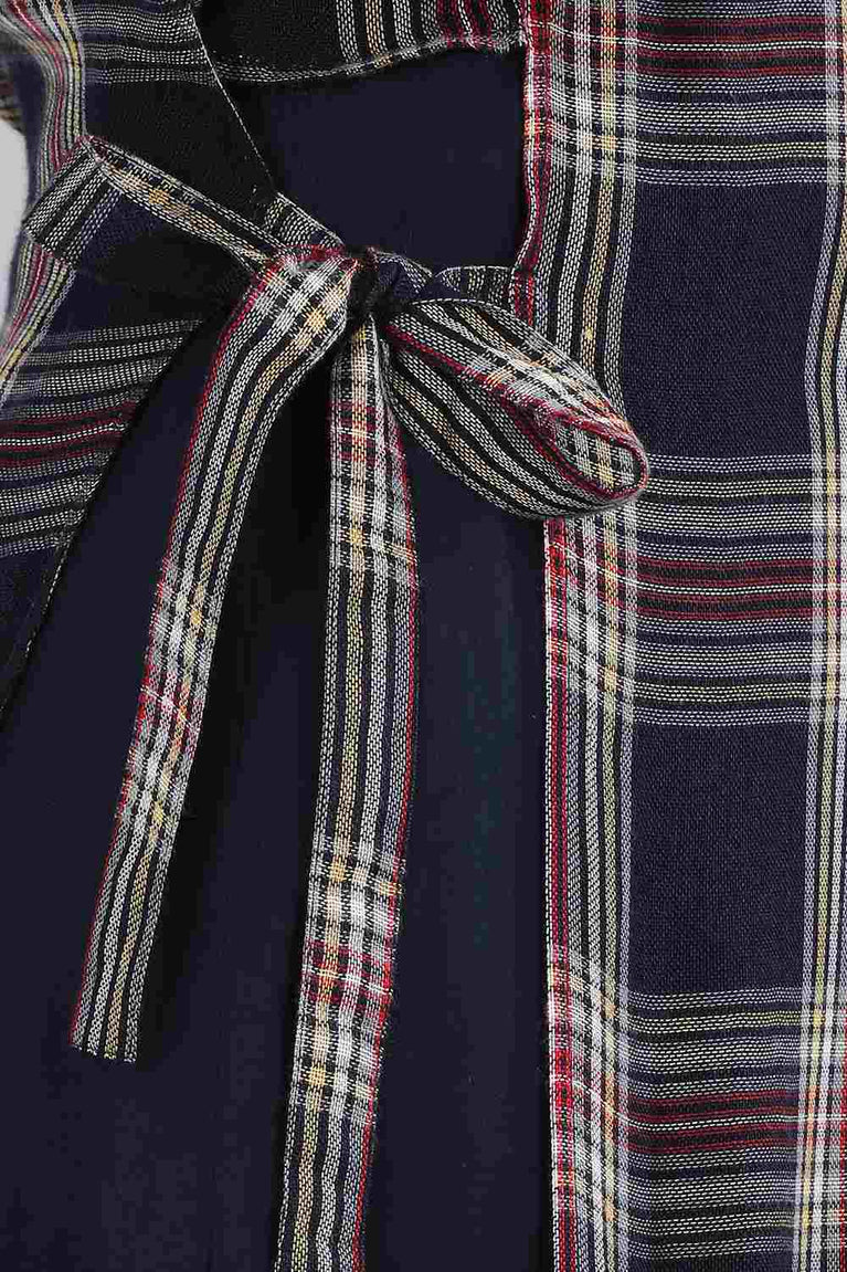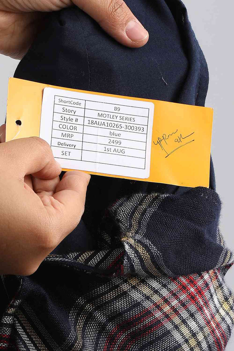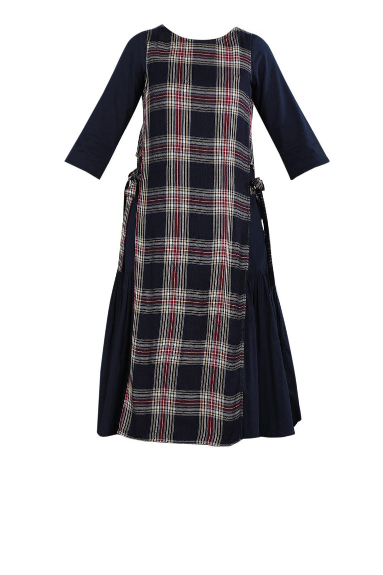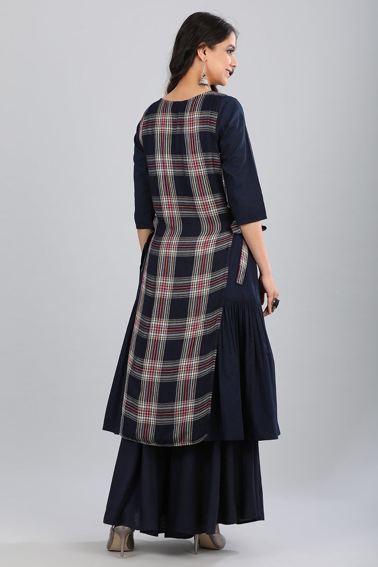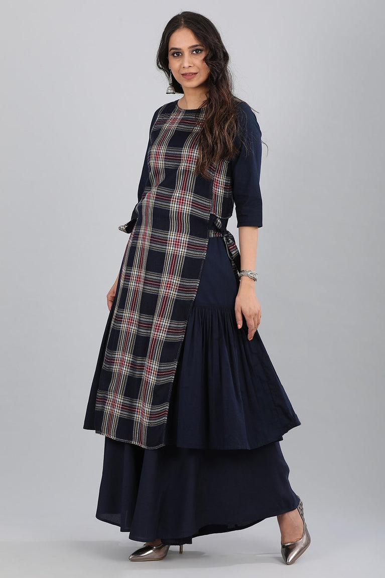 Blue shirt collar A-line kurta with gathers, placket detail and checkered pattern. This is exclusively from Disha's must-have closet.