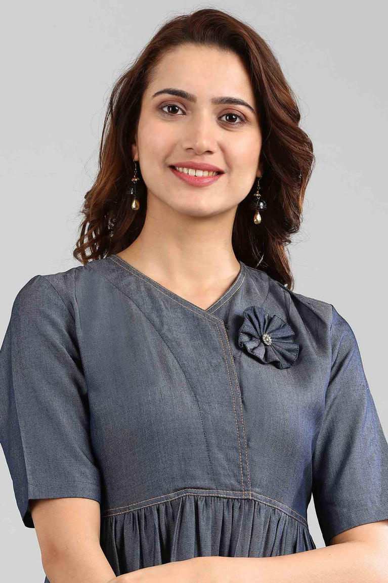 Blue A-line yarn-dyed Liva kurta with asymmetrical hemline and pocket detail.