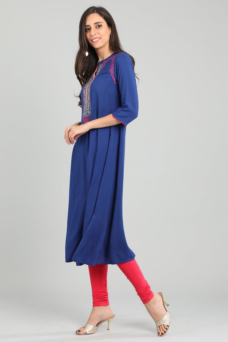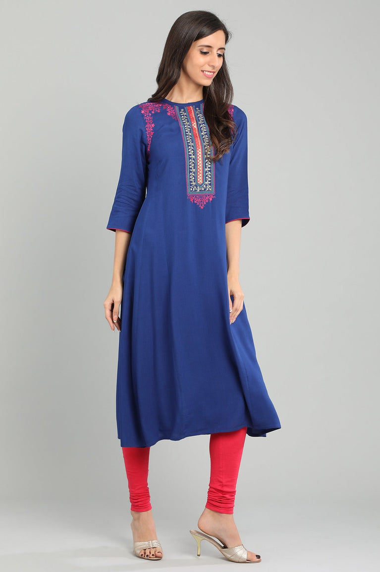 This A-line kurta is a perfect blend of traditional charm and modern design. Featuring side gussets for added style and comfort, it has a round neckline beautifully adorned with contrast colour embroidery. The 3/4th sleeves are also detailed with matching contrast embroidery, elevating the overall look. Set against a striking blue base, the fabric is printed with vibrant orange hues and golden accents, making it ideal for festive occasions or casual gatherings.