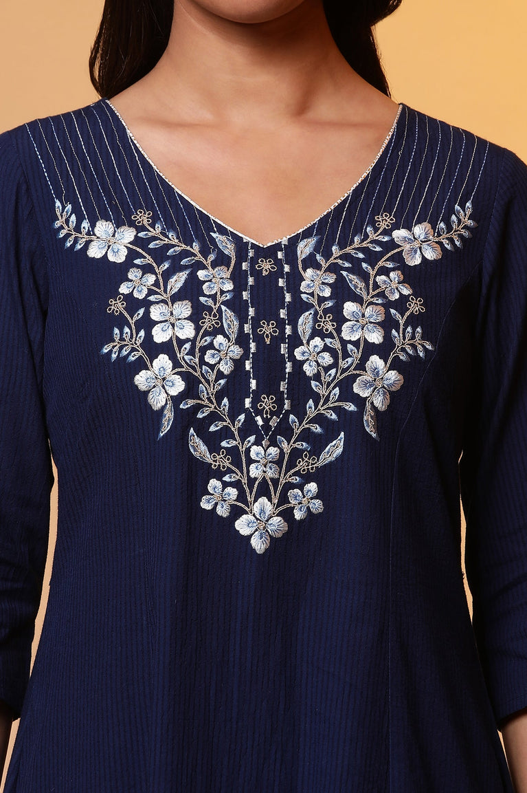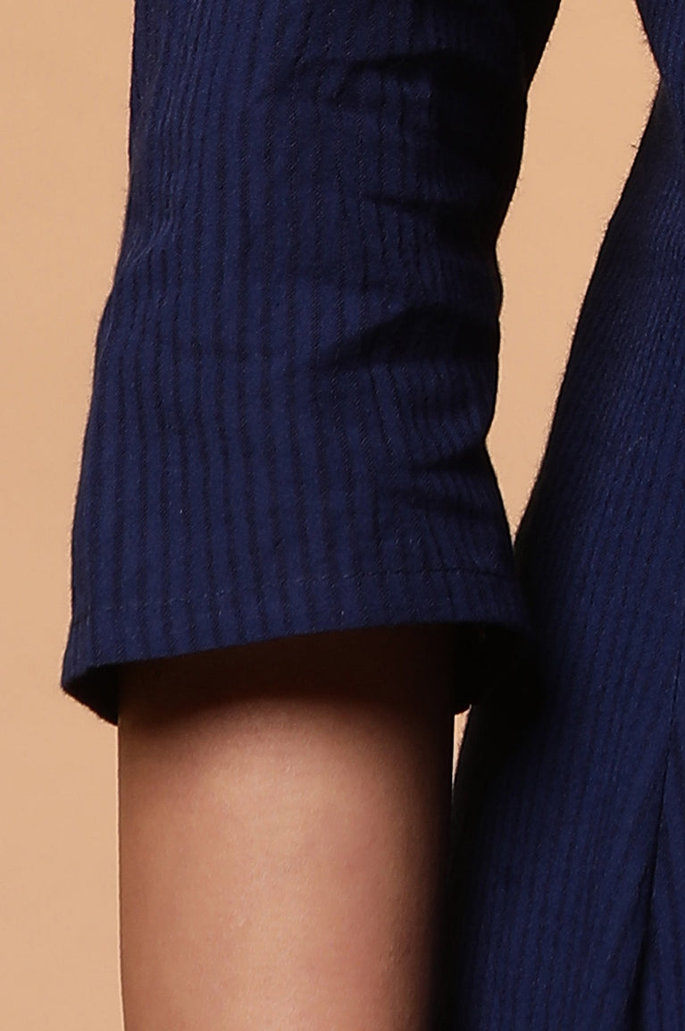 Navy blue Y/D A-line kurta in shirt collar with half placket and buttons. The kurta also features rolled-up sleeves.