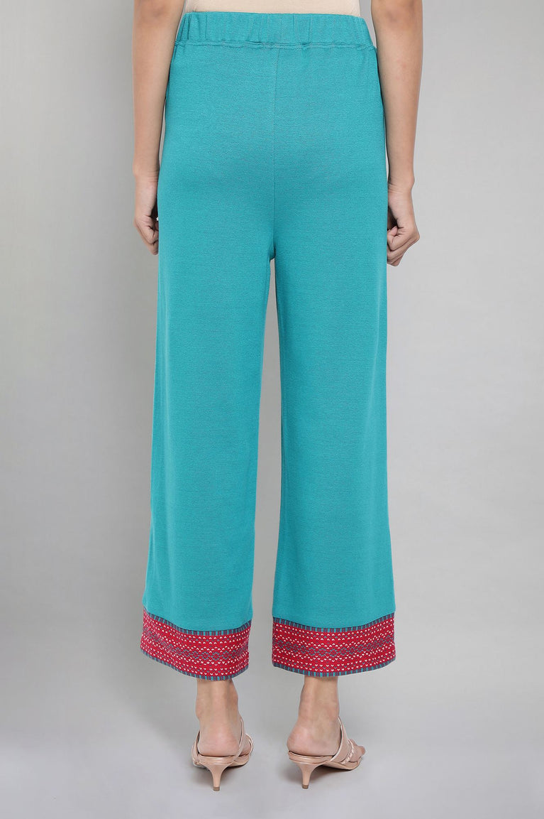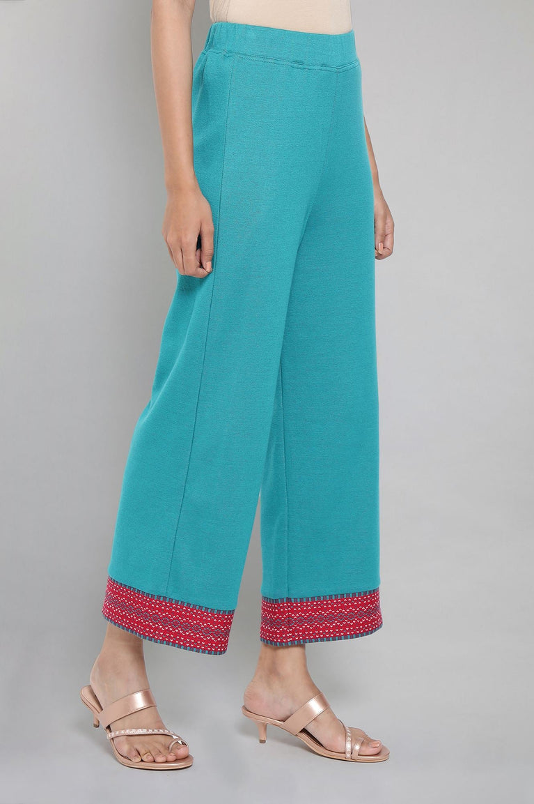 Slay this winter in aqua blue solid palazzo pants. The palazzos have mid-rise, elasticated waistband and border at hem.