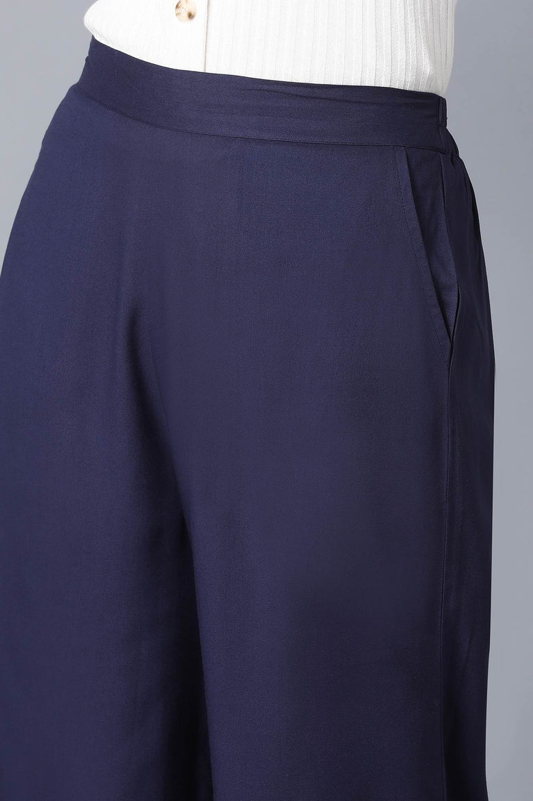 Blue solid straight palazzo pants in mid-rise and partially elasticated waistband. The palazzo pants features two front pockets and georgette insert at hem.