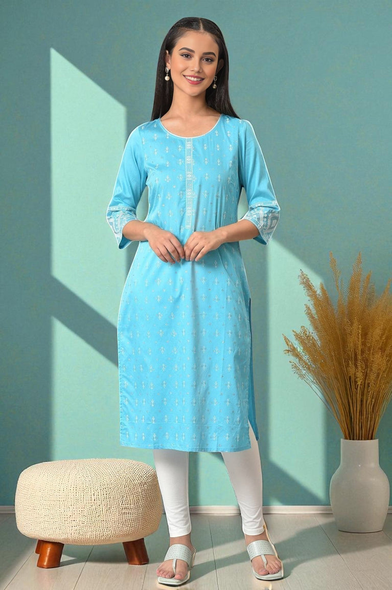 A perfect pick for your casual and workwear wardrobe. This blue straight silhouette printed kurta has round neck and three-quarter sleeves.