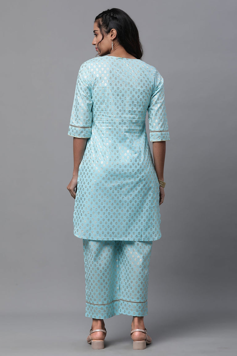 Blue Floral Foil Printed Short Kurta and Pants Co-ord Set