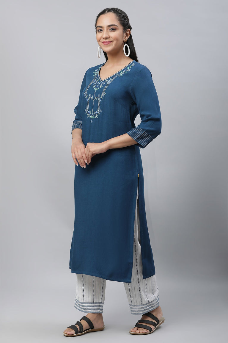 Blue Embroidered Rayon Kurta