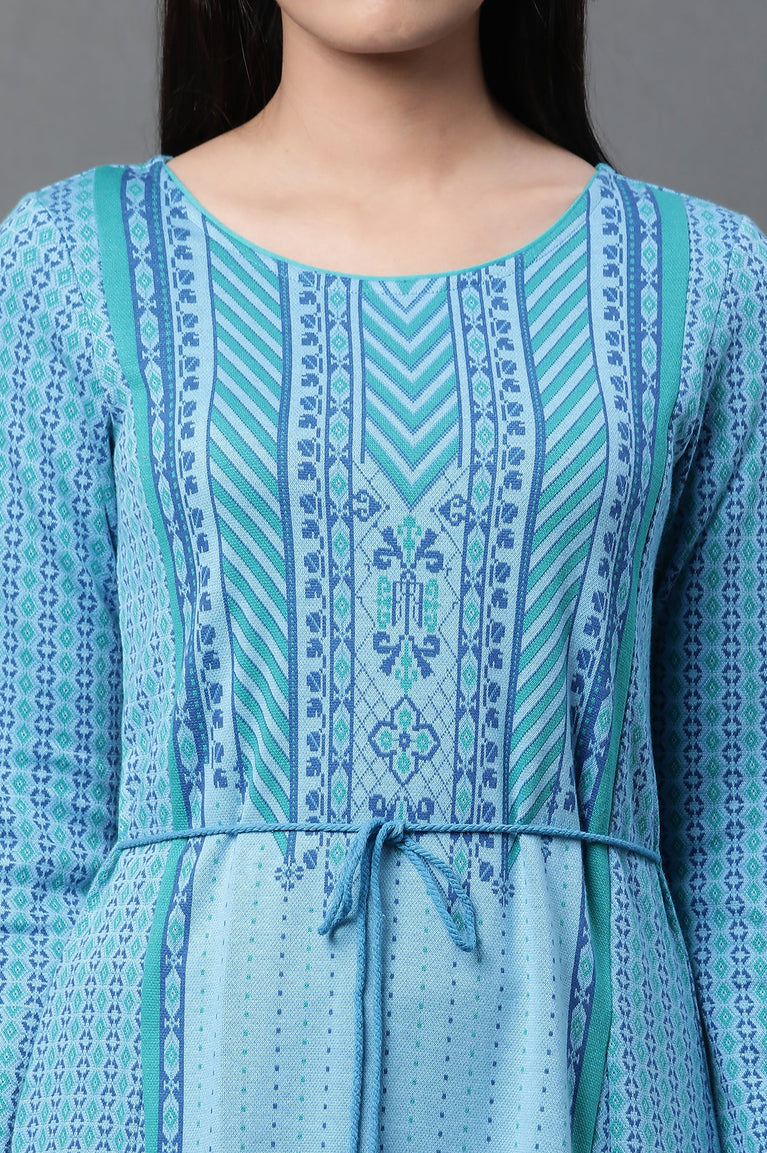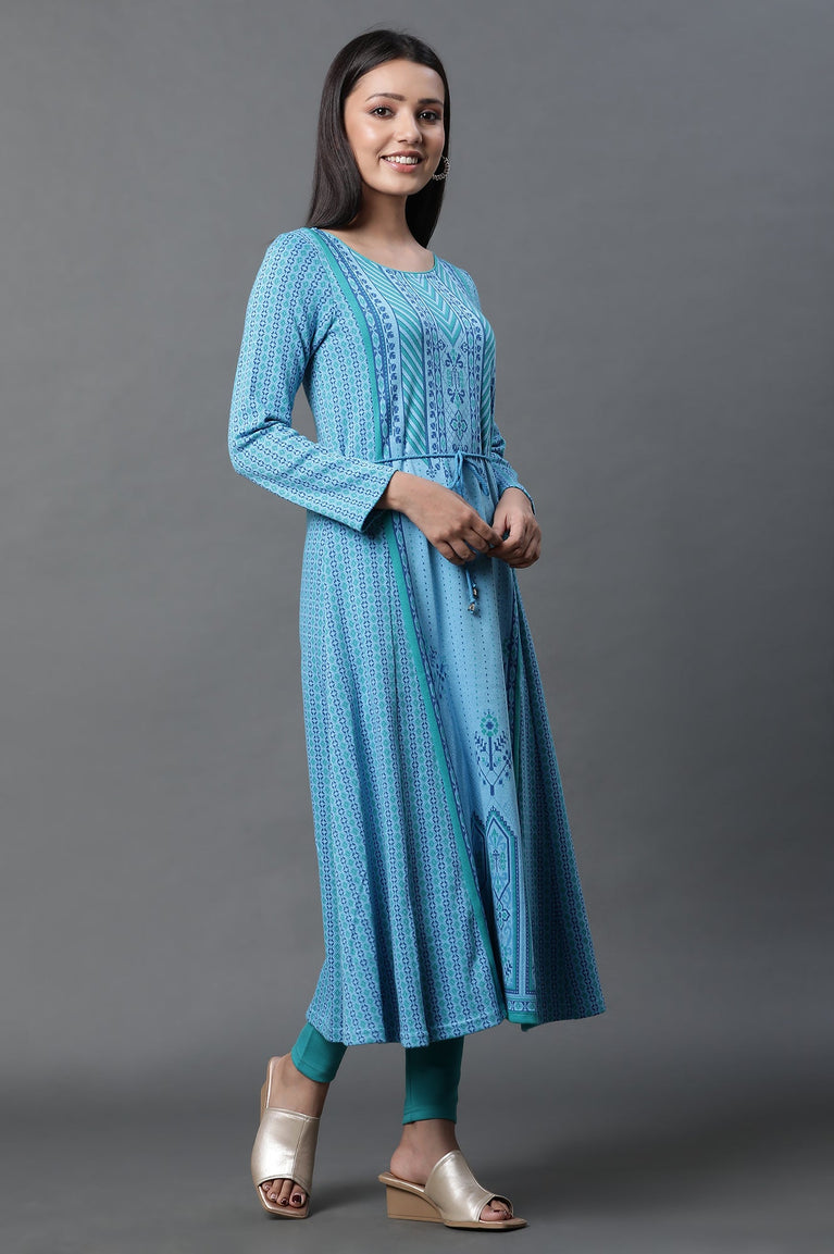 Blue Printed Flared Kurta and Tights Winter Set