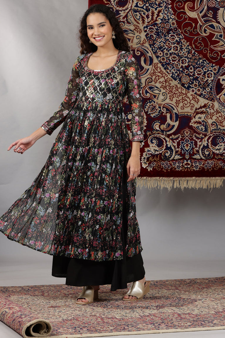 Black Floral Printed High-Slit Flared Kurta, Palazzos and Dupatta Set