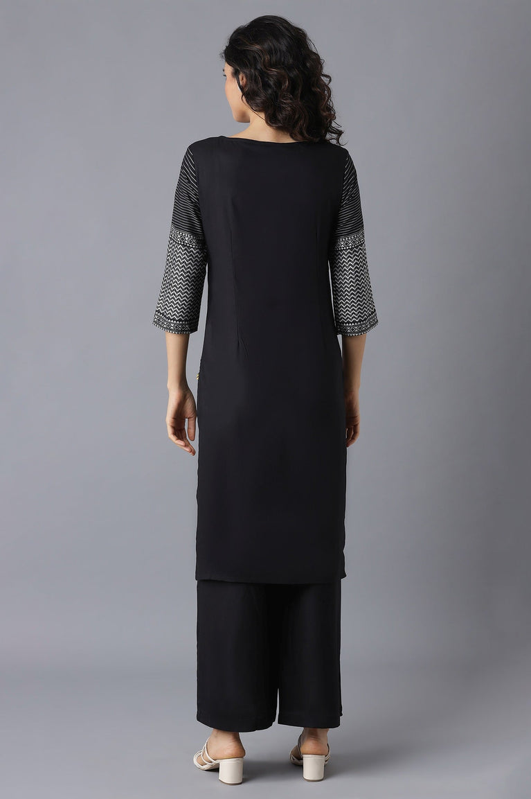 Black printed kurta in round neck and three-quarter sleeves. Paired with matching mid-rise palazzo.