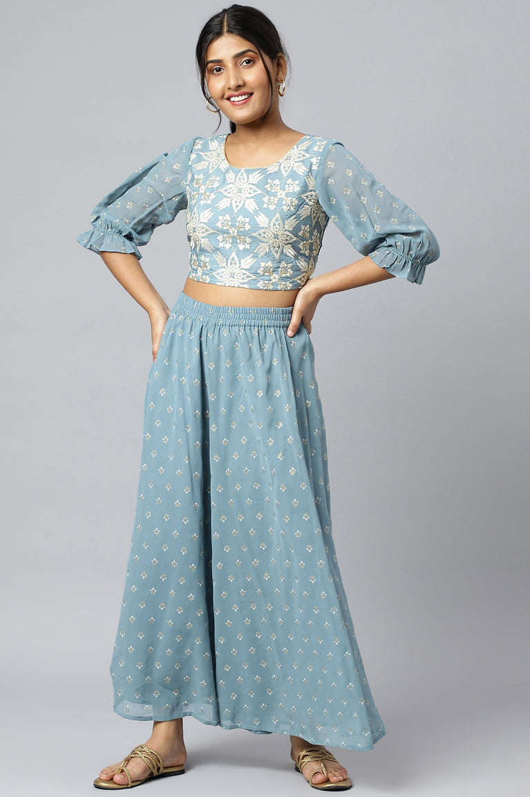 Blue Mist Embroidered Crop Top with Palazzo and Drape