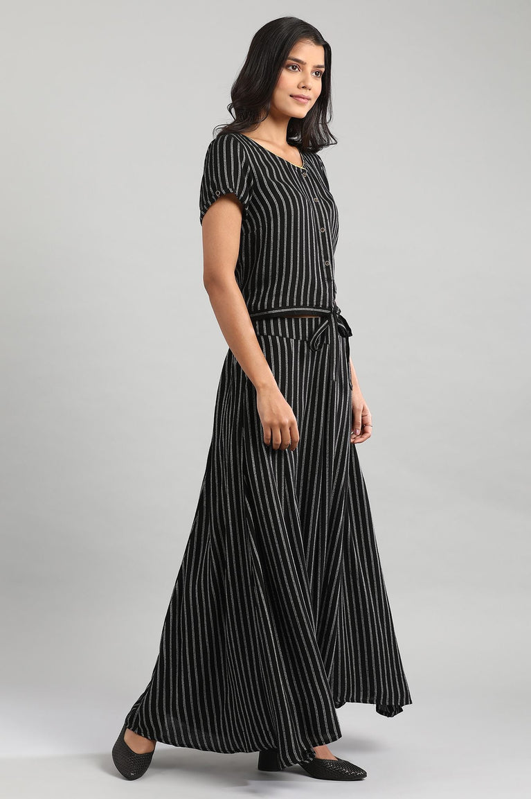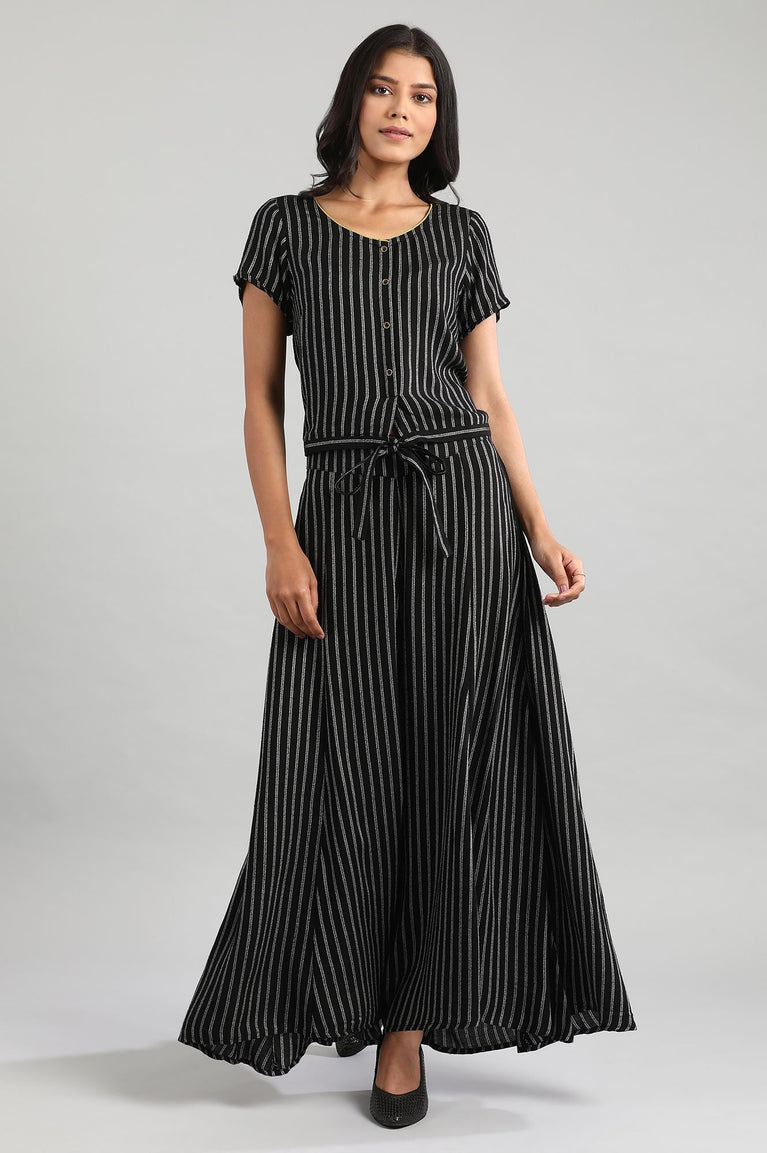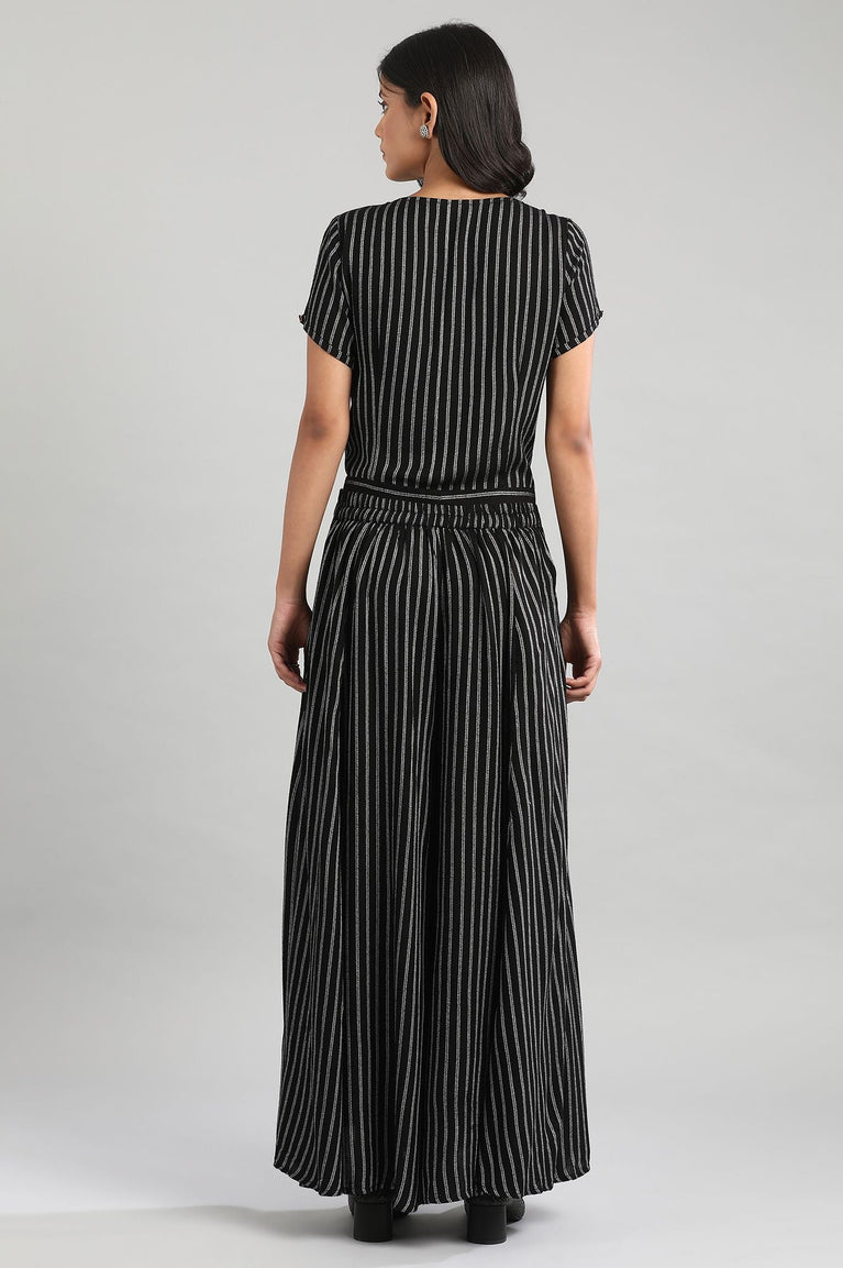 Our rayon crepe lurex striped kurta is a stunning addition to your wardrobe. This splendid piece features A-line silhouette with V neckline. The chunky embroidery detail on the neck and sleeves add an extra touch of boldness and sophistication while the lurex adds a subtle sparkle that will distinguish you from the crowd. This asymmetrical kurta is apired with our blue denim lycra jeggings.