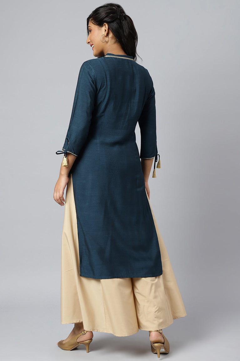 Blue round neck 3/4 sleeve kurta with embellished yoke detail.