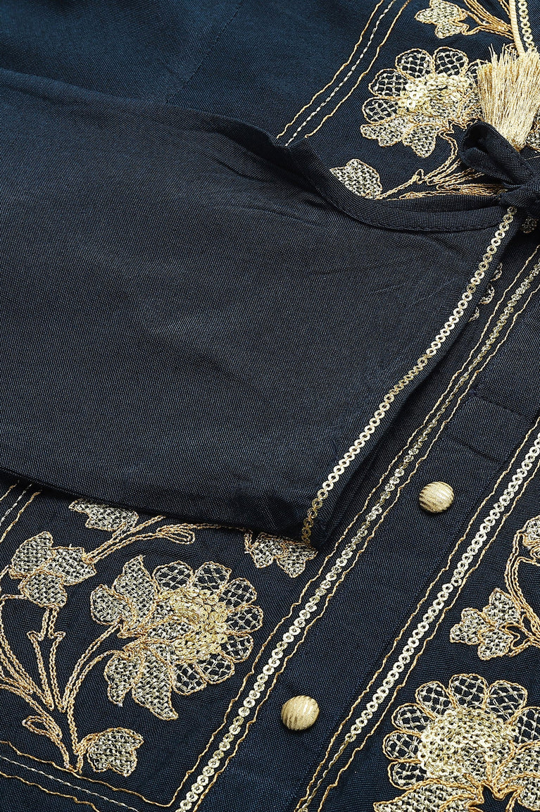 Love embroideries? Dont worry, we've got you covered. Buy this elegant embroidered kurta that features floral motifs embellished with gold sequins and dori work. It is crafted in a premium rayon fabric which falls like a dream. It comes with a mandarin collar, a placket and tie detail at the sleeves.