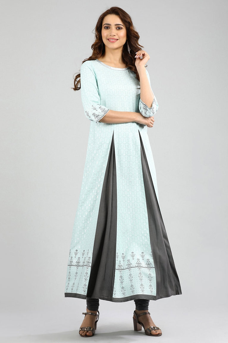 Blue round neck pleated kurta with printed detail.