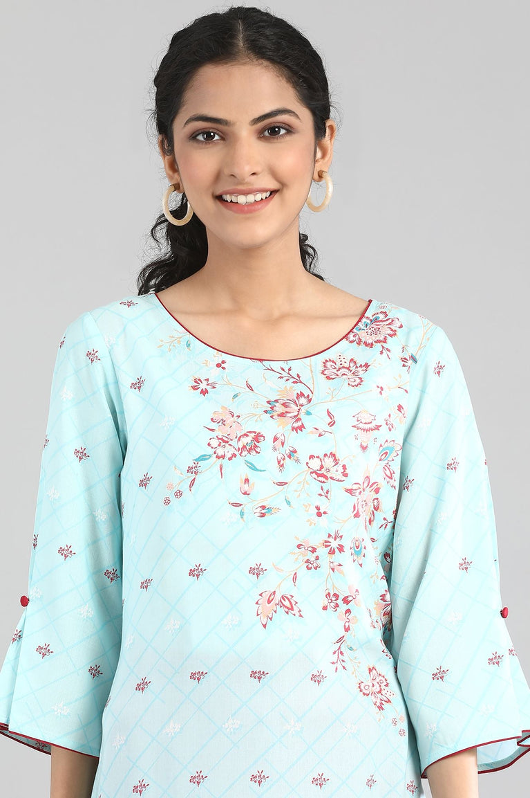 Pagoda blue printed kurta in round neck and three-quarter sleeves.