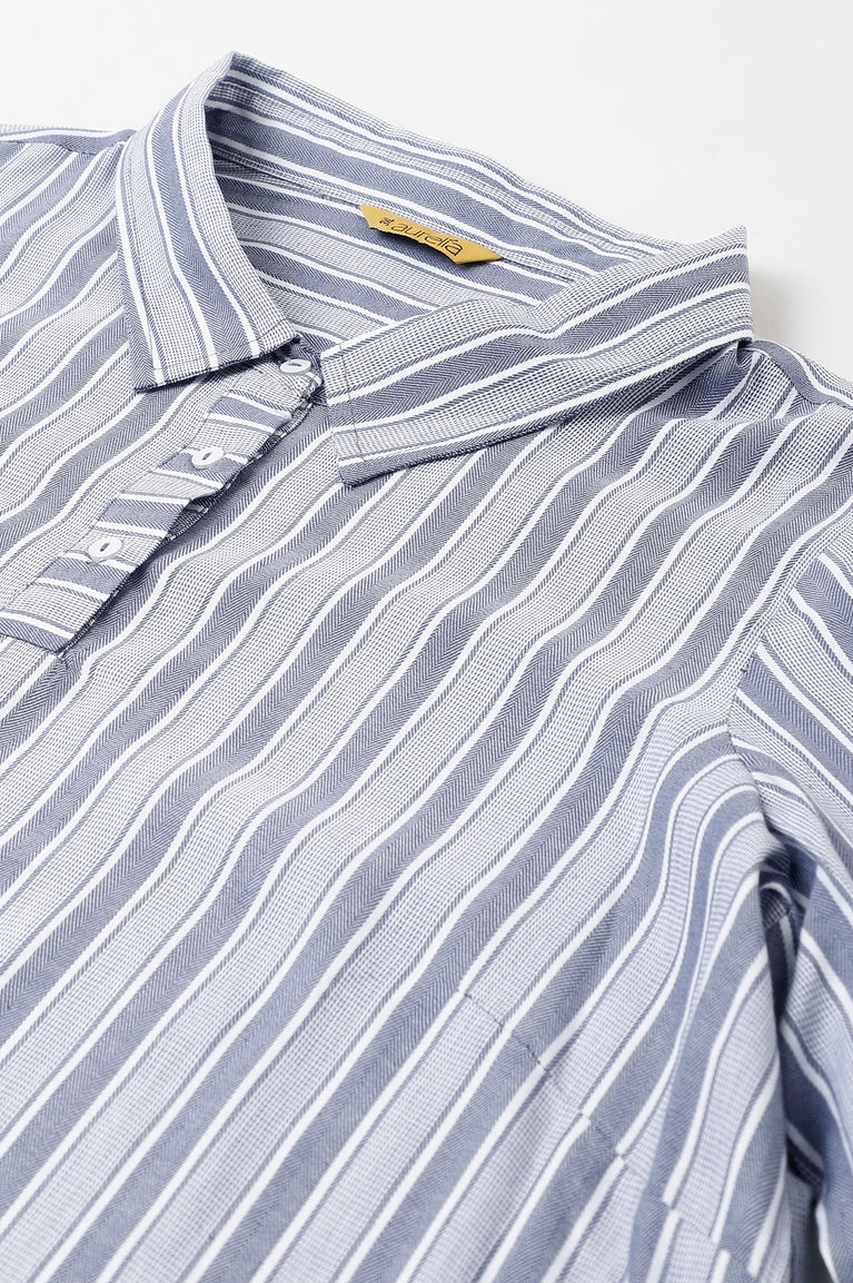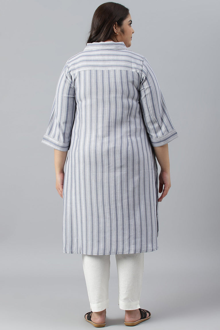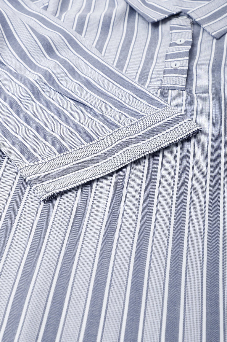 Blue Stripe Print Shirt Collar Plus Size kurta