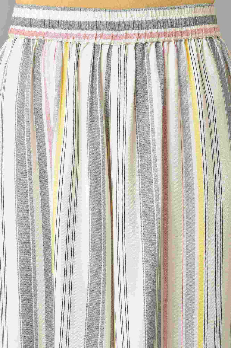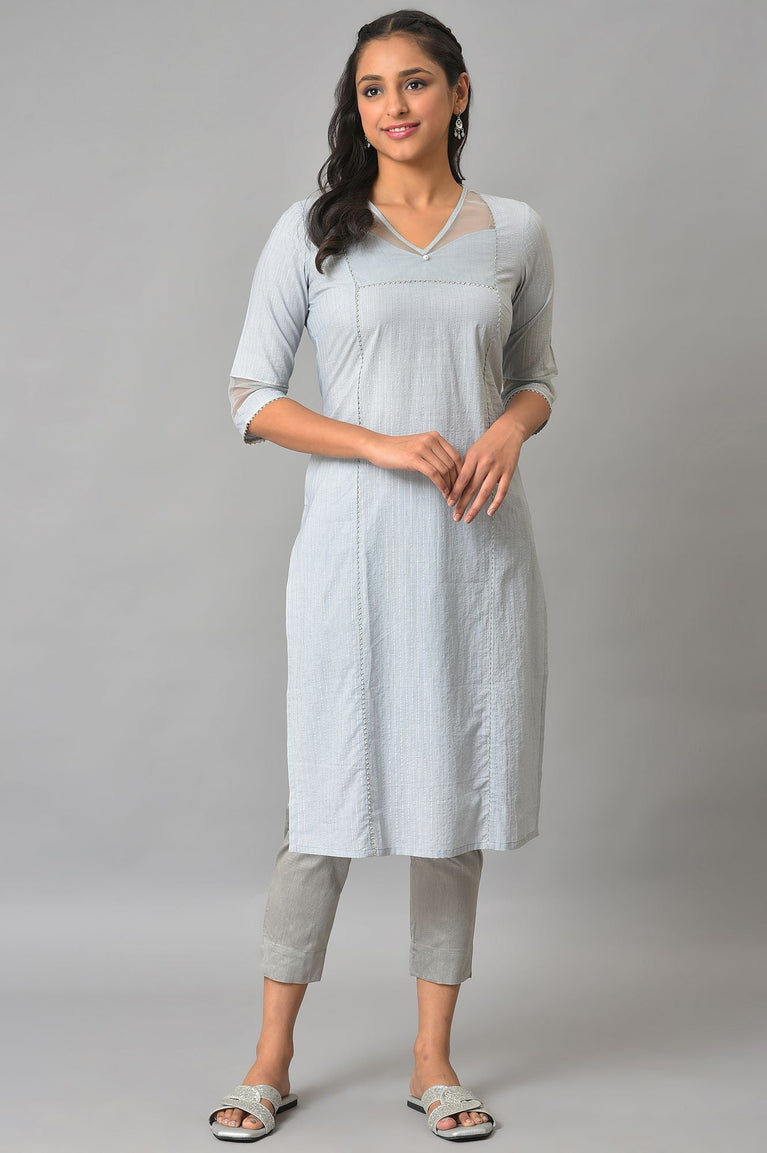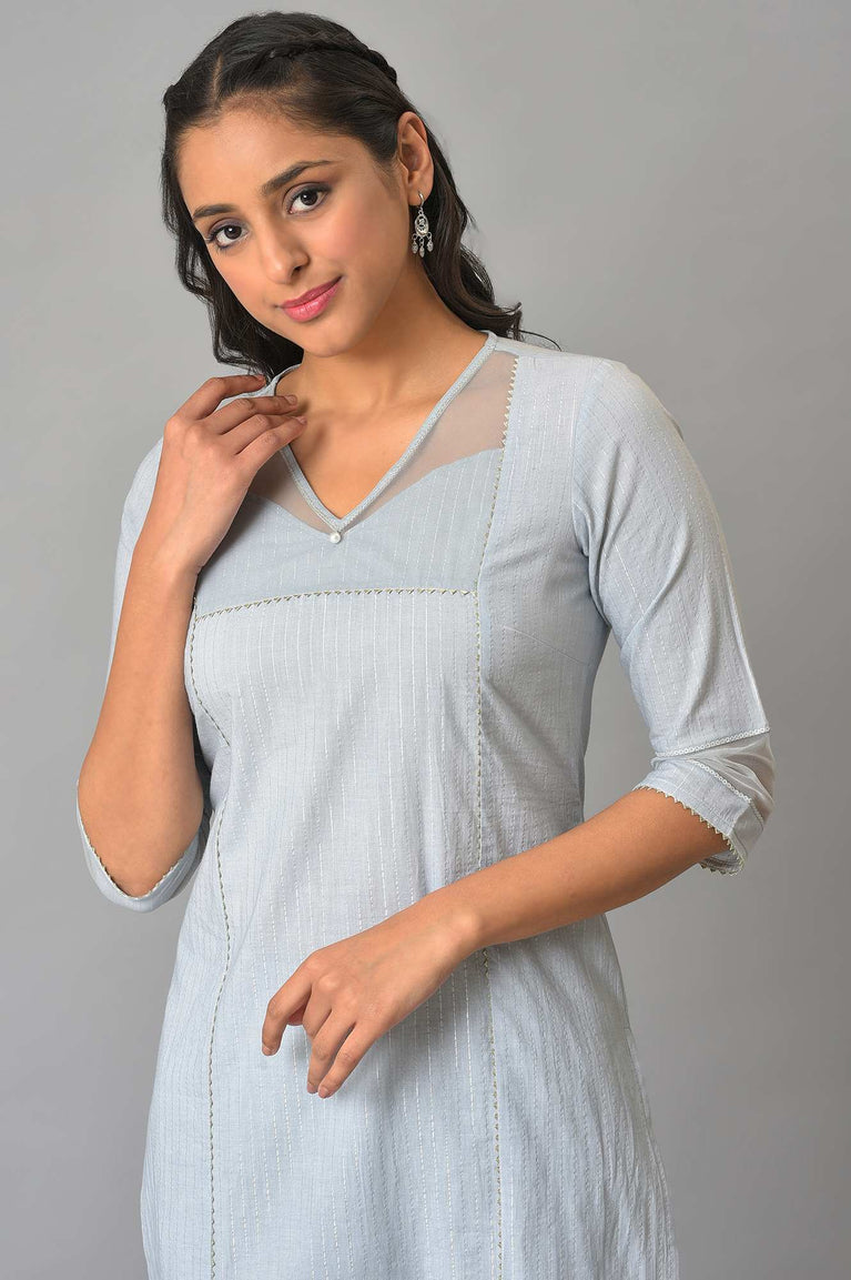 Make A Statement With Our New kurta Featuring A Sheer Neck & Sleeve Detail. It Is Made In Soft Lurex Striped Cotton Fabric, Perfect For Summer Occassions.
