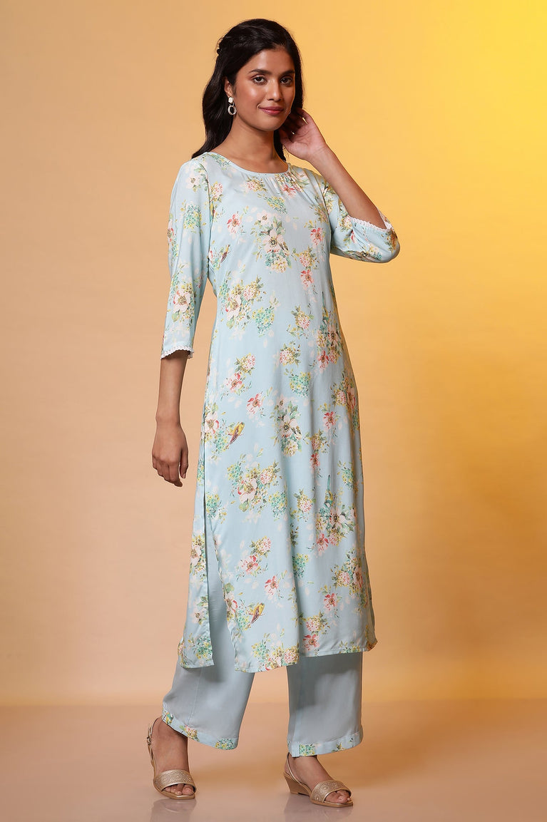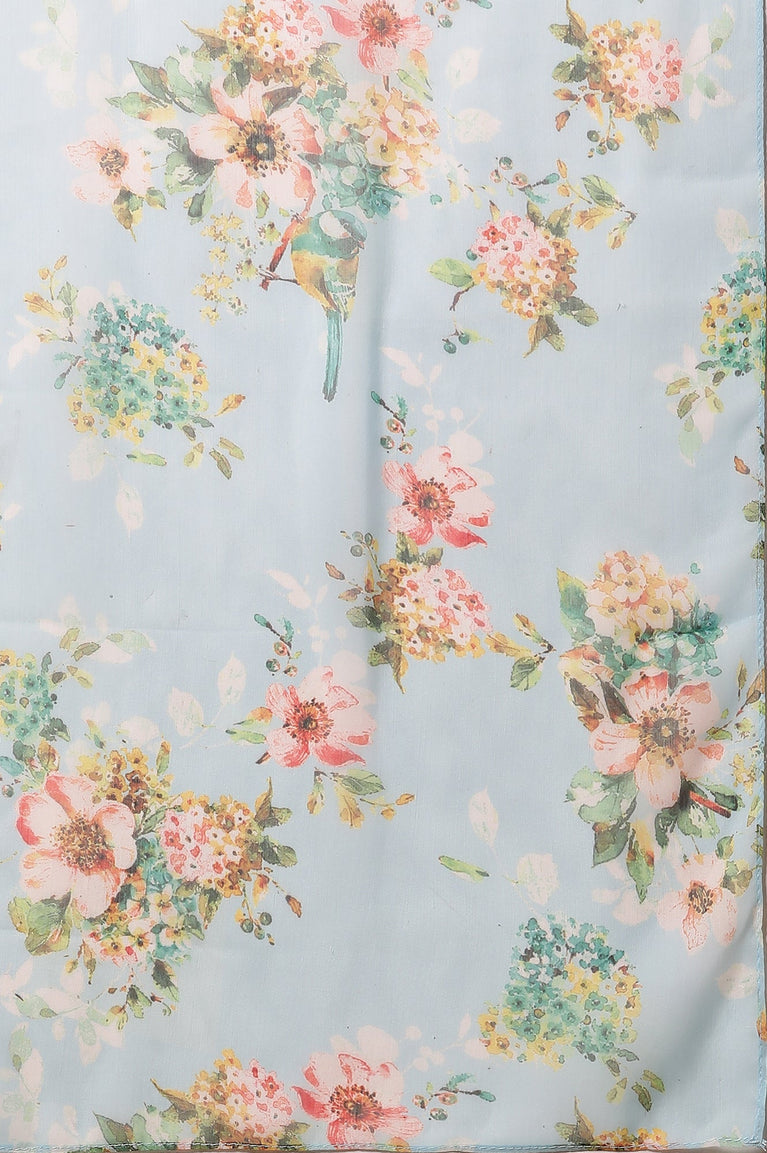 Blue Floral Printed Straight Kurta, Pants and Dupatta Set
