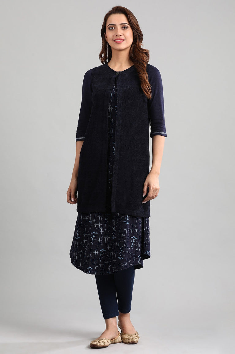 Blue round neck yarn-dyed winter kurta with curved hemline.