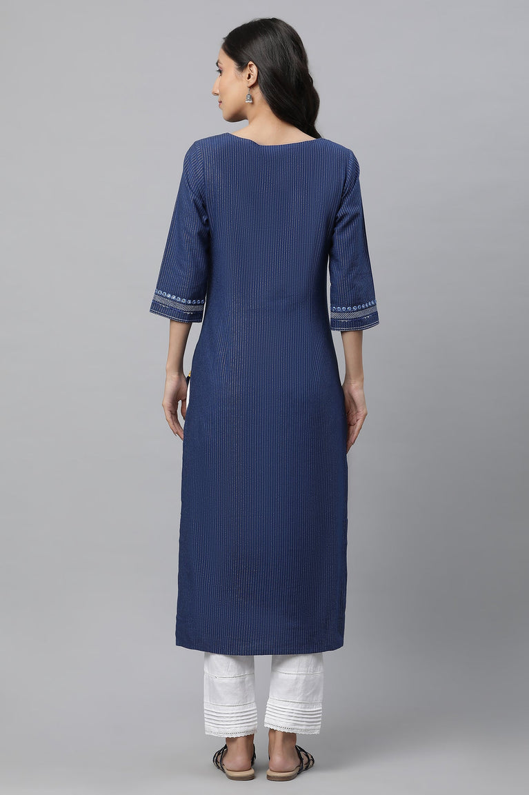 Dress up in the classic silhouettes with intricate detailing, lavish prints and rich hues to accentuate your festive look. This kurta set contains a blue glittered geometric print panelled kurta featuring zari embroidered yoke with round neckline and three-quarter sleeves. Well-matched with ankle length solid palazzos.