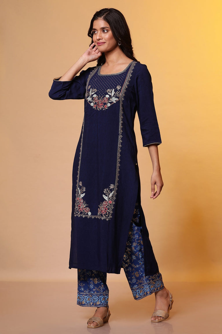 A canvas of deep sapphire artistry, this straight silhouette kurta for women is a testament to timeless grace. This garment flows with an understated elegance, designed for moments that call for a touch of traditional splendor. Its classic round neckline serves as the perfect frame for a magnificent yoke, which is lavishly decorated with intricate, multi-hued floral embroidery that cascades beautifully down the front. This detailed ornamentation is a stunning display of craftsmanship, transforming the tunic into a piece of wearable art. The three-quarter sleeves are thoughtfully designed, culminating in a matching embroidered border that mirrors the yoke's rich beauty, adding a harmonious finish to the design. Crafted for comfort and a flattering fit, this ethnic tunic features a clean straight hemline with side slits, ensuring ease of movement. The fabric is fully opaque, offering complete coverage and confidence. You’ll find this navy blue embroidered kurta to be a wonderfully versatile addition to your festive ethnic wear wardrobe. It’s an essential piece for anyone seeking a blend of classic design and modern appeal, perfect for celebrations and special gatherings where making a sophisticated impression is key. This single-piece kurta is a celebration of exquisite detail.