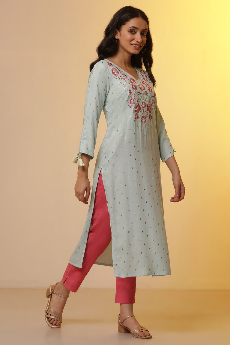 Discover effortless elegance with this Aurelia aqua-colored kurta, perfect for casual occasions. Crafted using a woven construction technique, this fusion-style piece features a sophisticated band neckline and practical three-quarter sleeves. The below-knee length and straight silhouette create a flattering profile, while the slit detail adds a touch of modern flair. Made from a luxurious blend of 60% modal fabric, this kurta offers both comfort and style. The versatile design makes it an ideal choice for women looking to elevate their everyday wardrobe with a hint of ethnic charm. The viscose composition ensures breathability and a soft feel against the skin, making it suitable for all-day wear. Whether paired with leggings or palazzo pants, this Aurelia kurta is sure to become a staple in your casual wear collection.