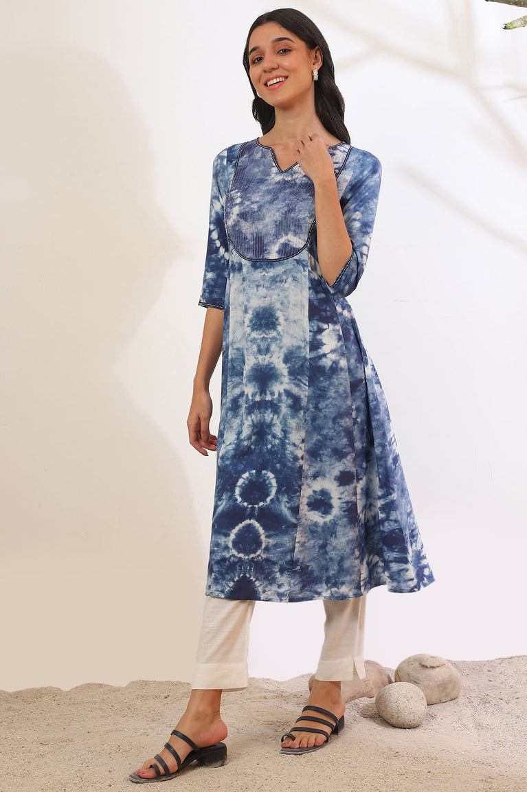 Blue Shibori Printed A-Line Kurta with Lace Detail