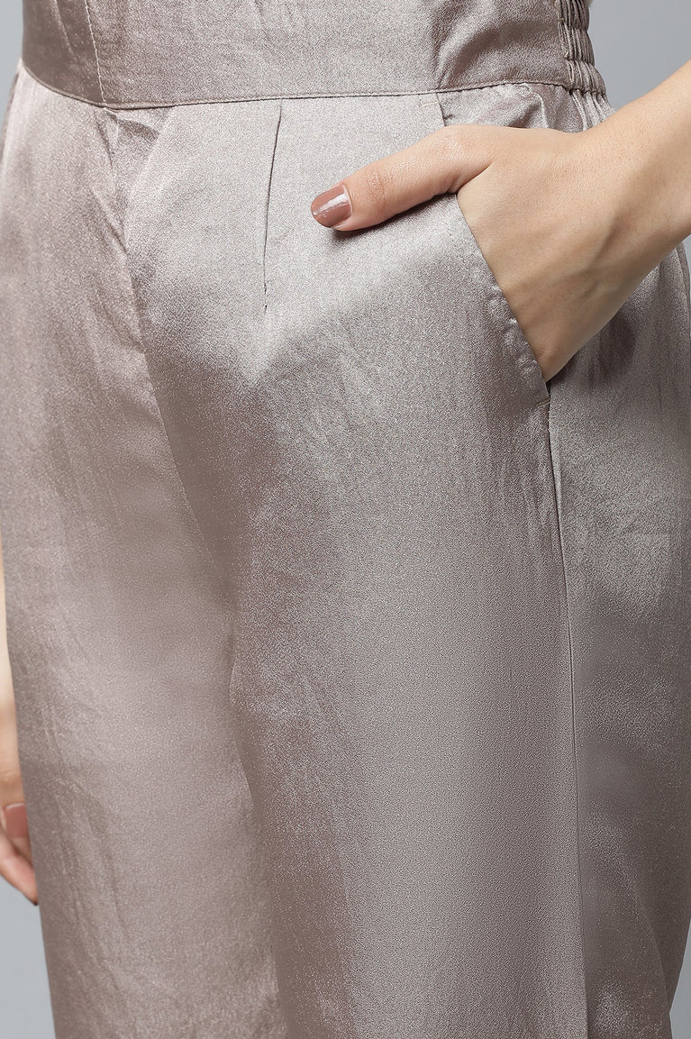 Grey round neck 3/4 sleeve kurta with printed detail and dori.
