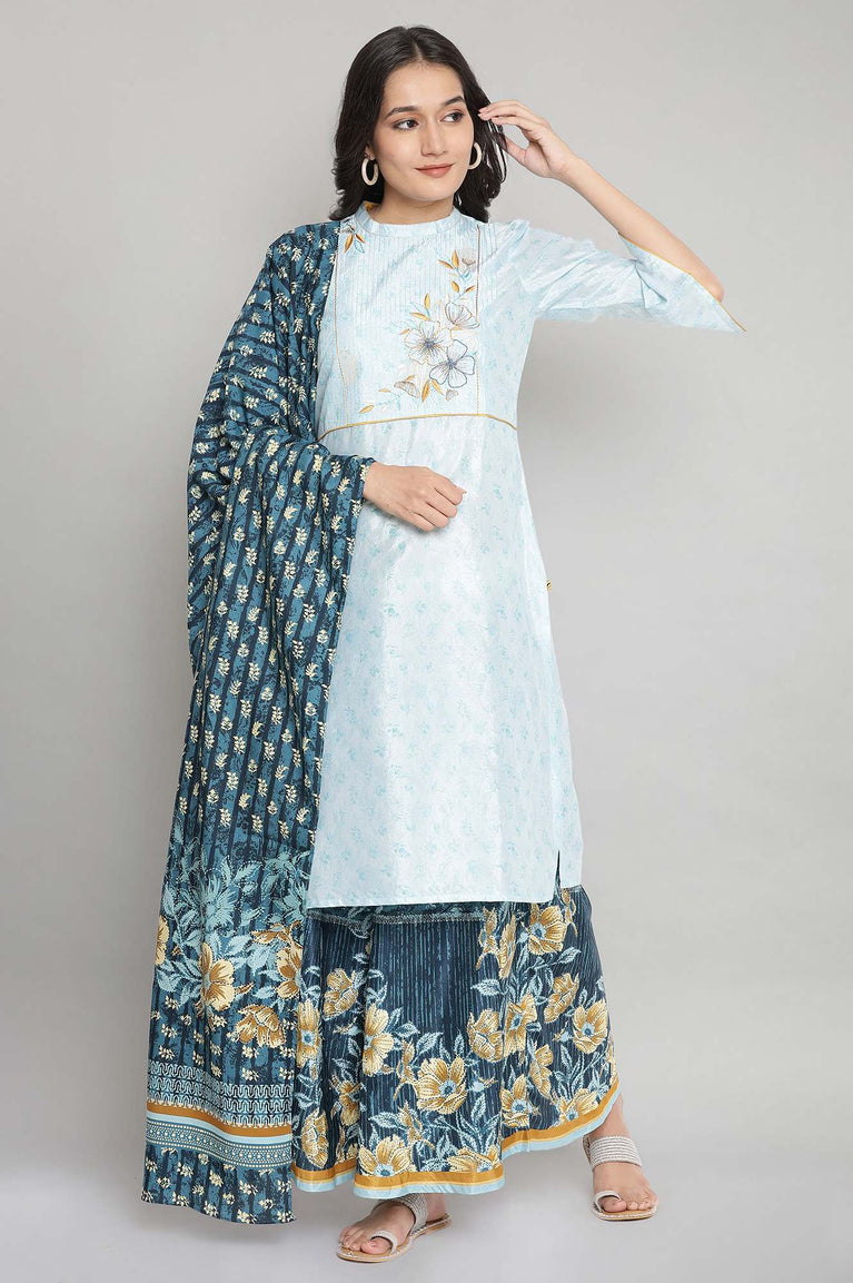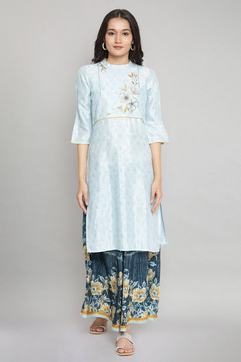 Feel Astounding In This Airy Blue Yarn Dyed kurta Accentuated With A Contast Lace Running All Around The Collar, Yoke And Sleeve Cuffs. This Is Sure To Make You Feel Top Notch.