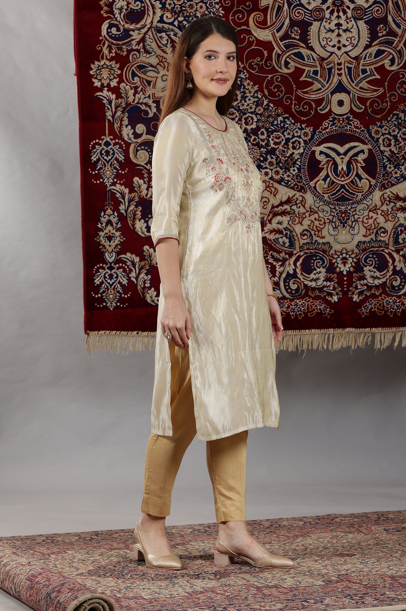 Beige Dori Embroidered Yoke Straight Festive Kurta
