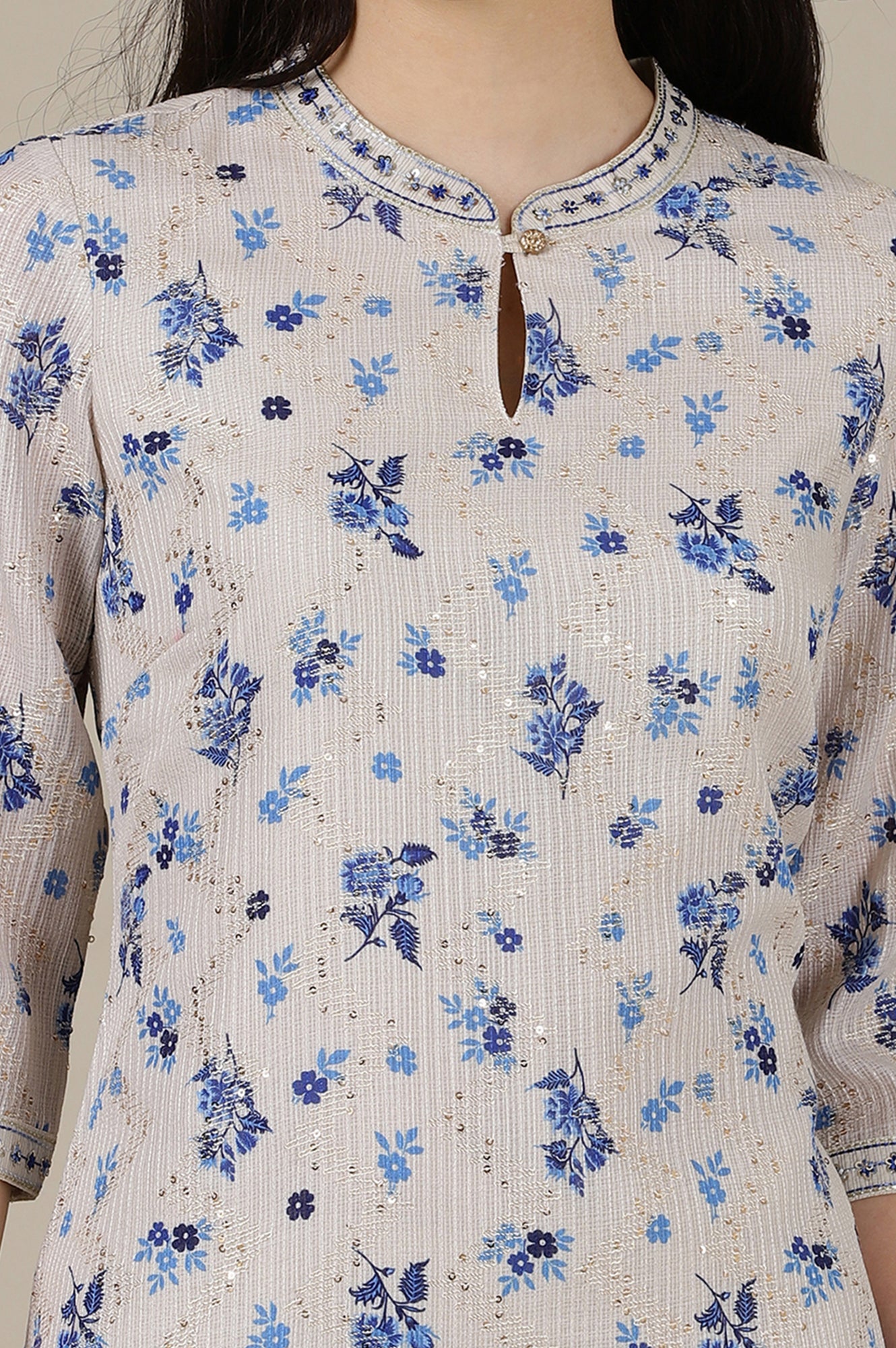 Crafted from sequins kota fabric, our straight kurta offers a subtle yet captivating shimmer. The mandarin collar, featuring a stylish slit, adds a touch of sophistication. Enhanced with exquisite embroidery on neckline and sleeves, this kurta effortlessly blends elegance with modern charm. Flaunt your unique style with this versatile piece, perfect for any occasion.
