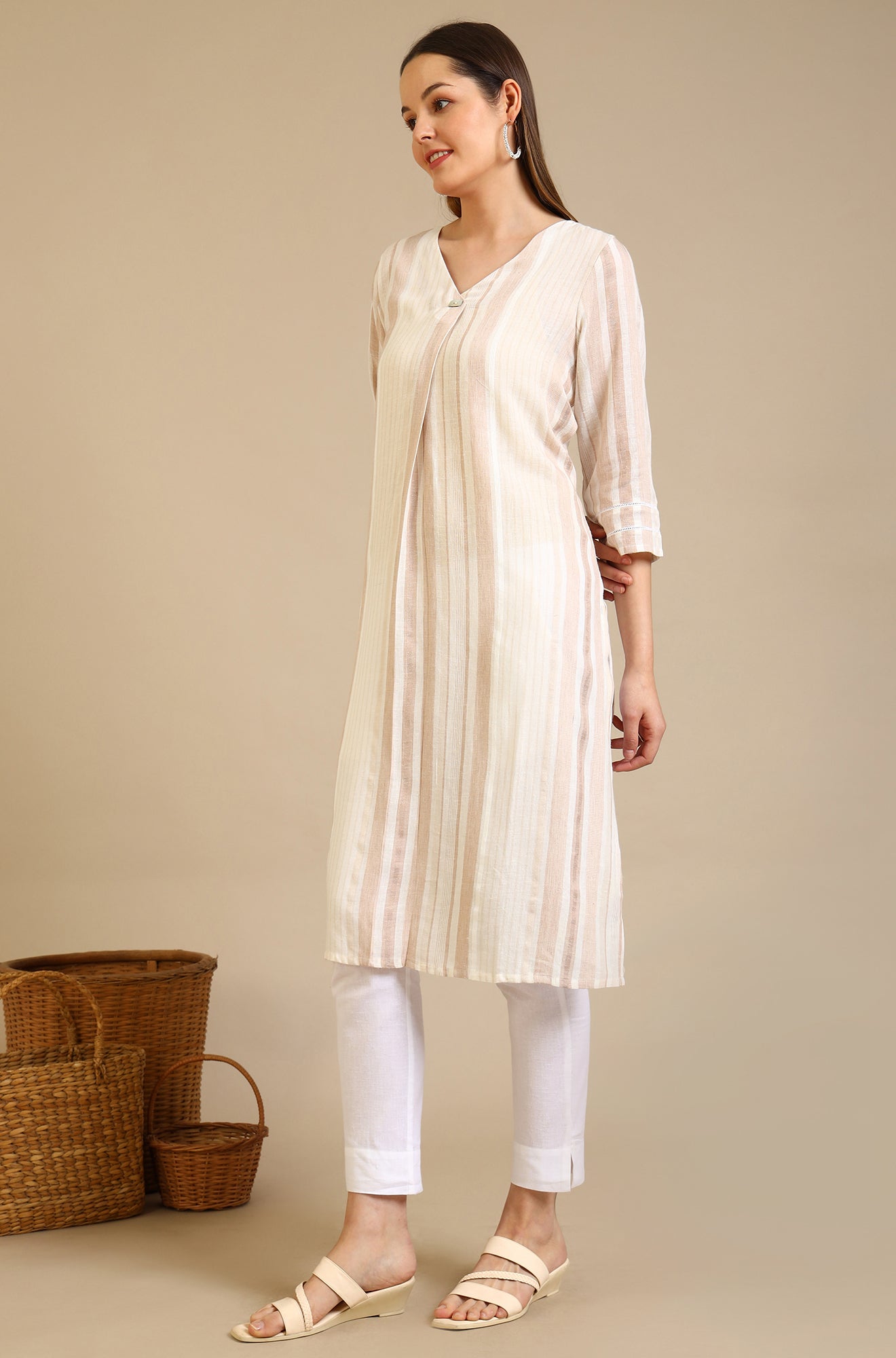 This yarn-dyed, relaxed-fit kurta seamlessly blends contemporary style with refined elegance. Designed with a chic V-neckline and button detailing, it exudes a modern yet effortless charm. The double lace inserts on the sleeves add a delicate touch, enhancing its visual appeal with subtle sophistication. Perfect for both casual and semi-formal occasions, this kurta offers a stylish and comfortable option for everyday wear.