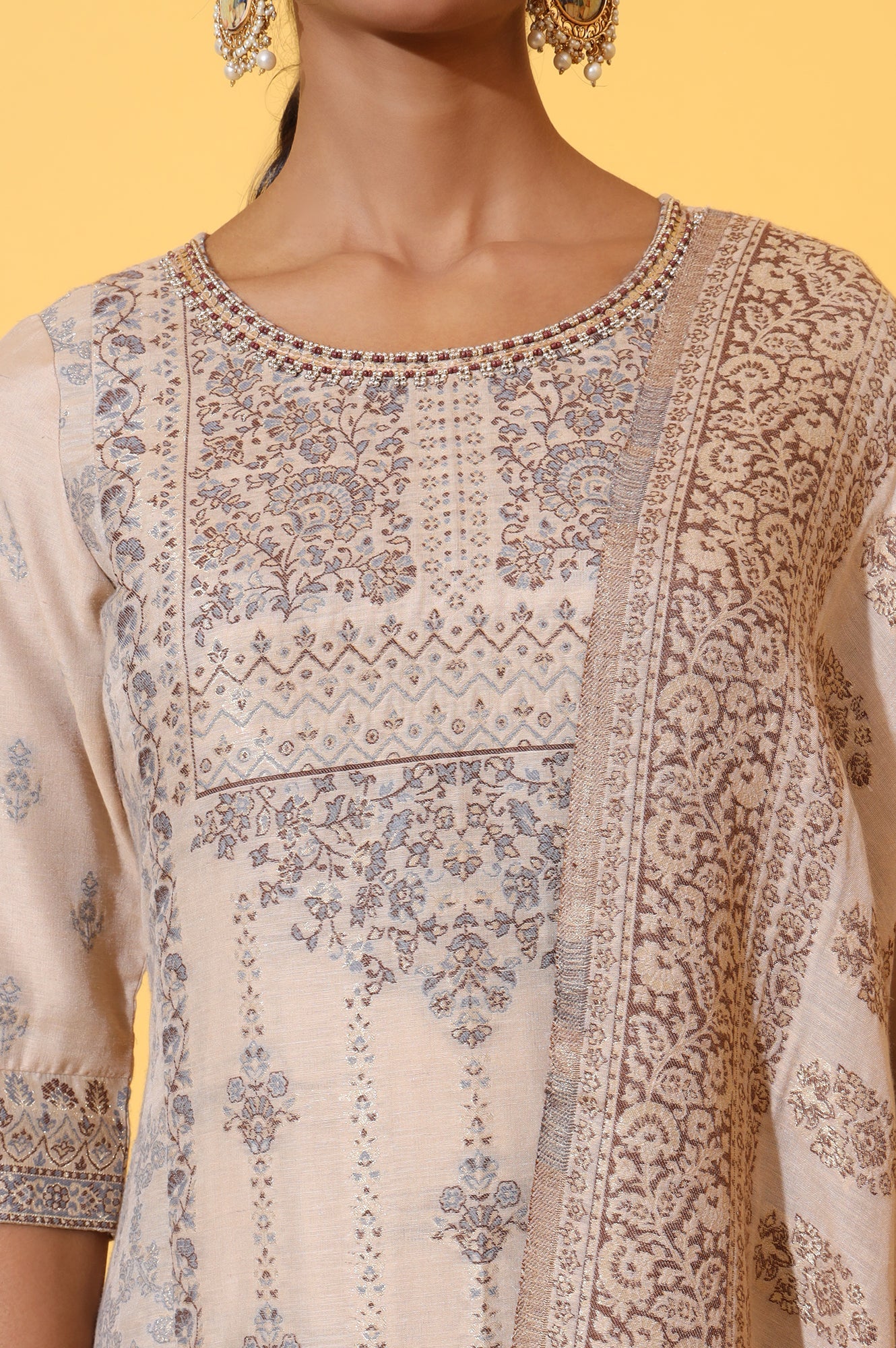 Embrace refined elegance with this beige panelled kurta set, crafted in breathable linen fabric. Featuring delicate embroidery around the neckline and a beautifully designed jacquard dupatta, this ethnic ensemble blends timeless style with everyday comfort. The soft, soothing color palette adds a graceful charm, making it perfect for festive wear, office attire, or family gatherings. This all-in-one ethnic outfit is designed to make you feel effortlessly stylish.
