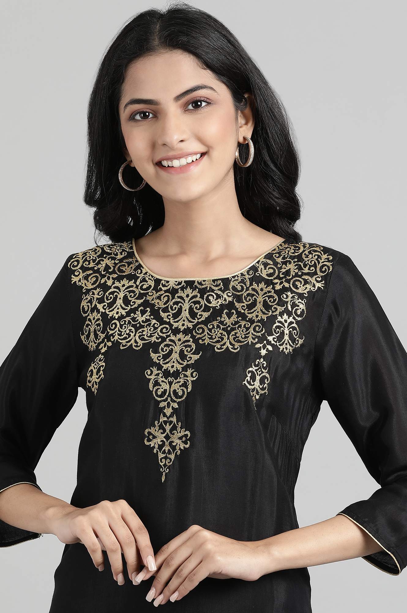 Black solid kurta in round neck a with zari embroidery, paired with flared solid palazzo pants in mid-rise and elasticated waistband.