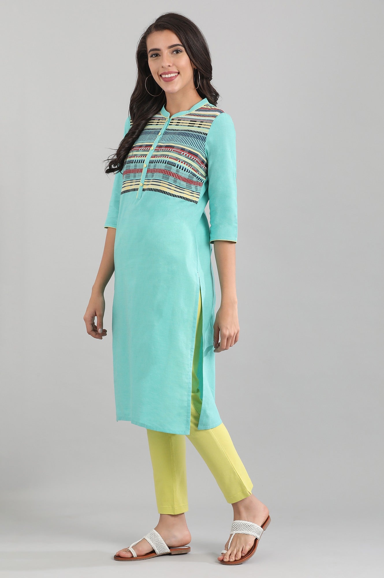 Blue band collar straight yarn-dyed kurta with placket detail on the front.