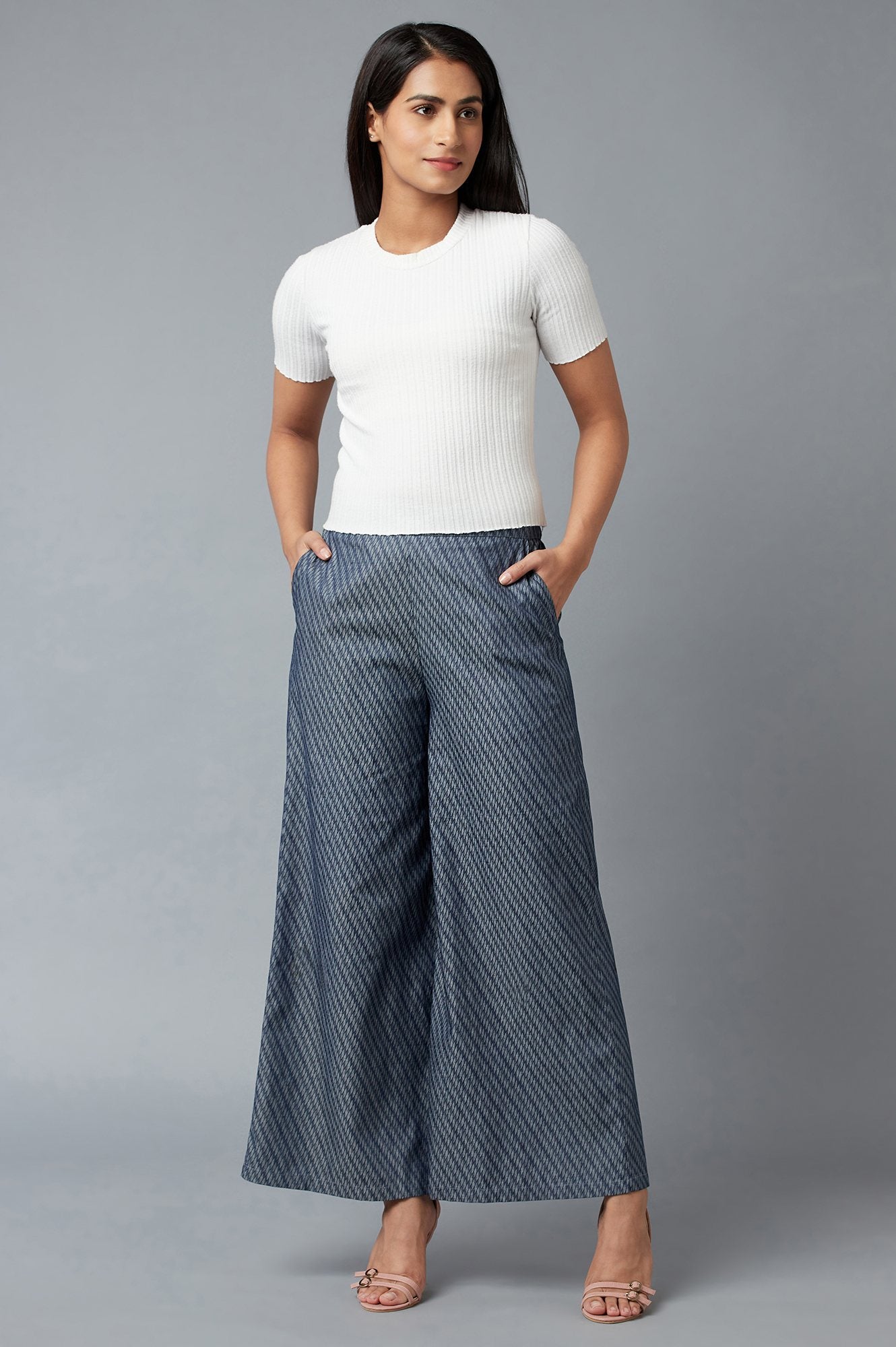 Micro-geometric precision weaving defines your traditional style with this flared palazzo. Featuring a geometric print and partially elasticated waistband, it offers high comfort with its premium woven cotton fabric. Imagine pairing this ankle-length fashion bottom with a kurta and sandals for a trendy look. A must-have in your wardrobe for casual outings.