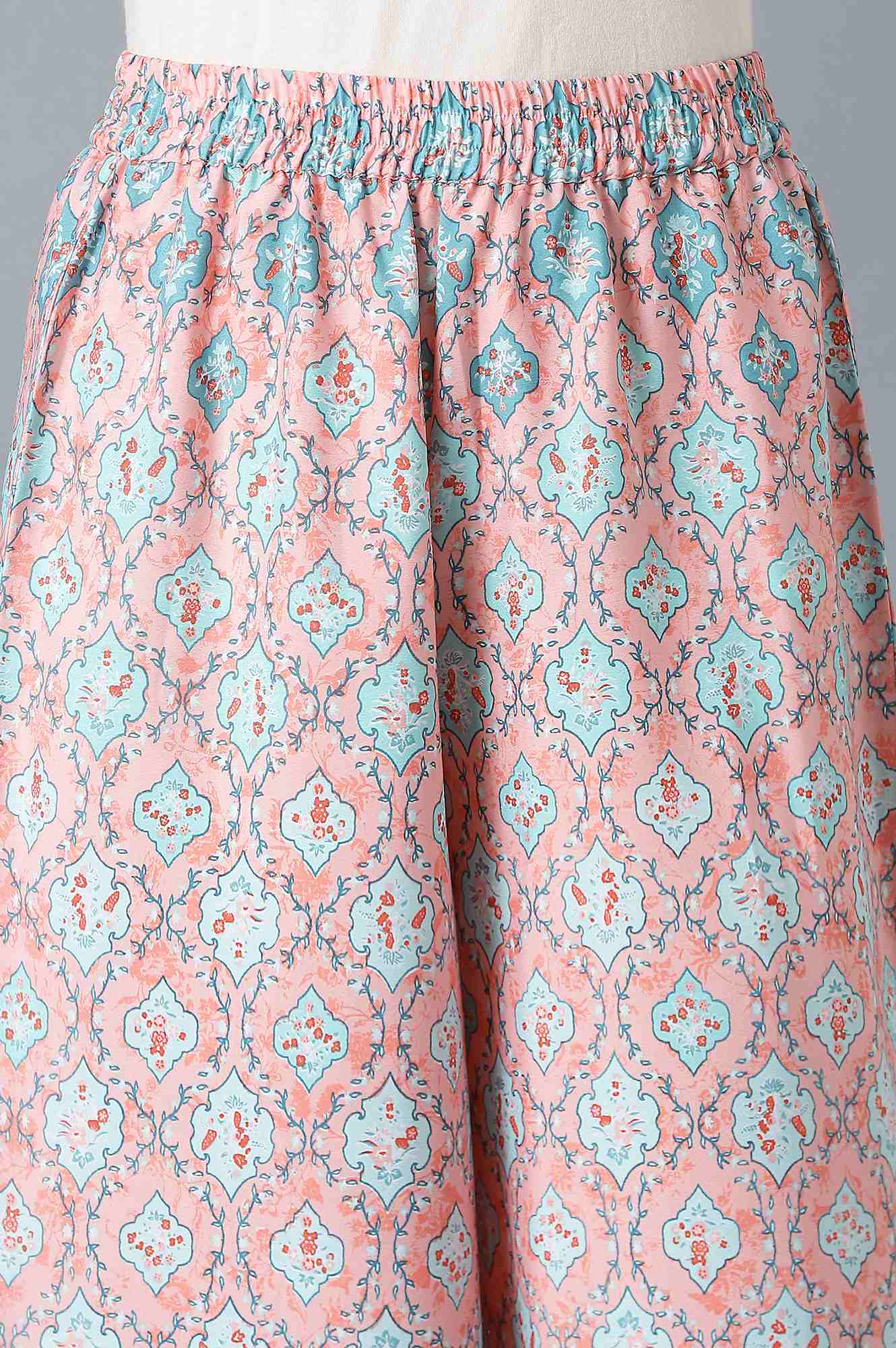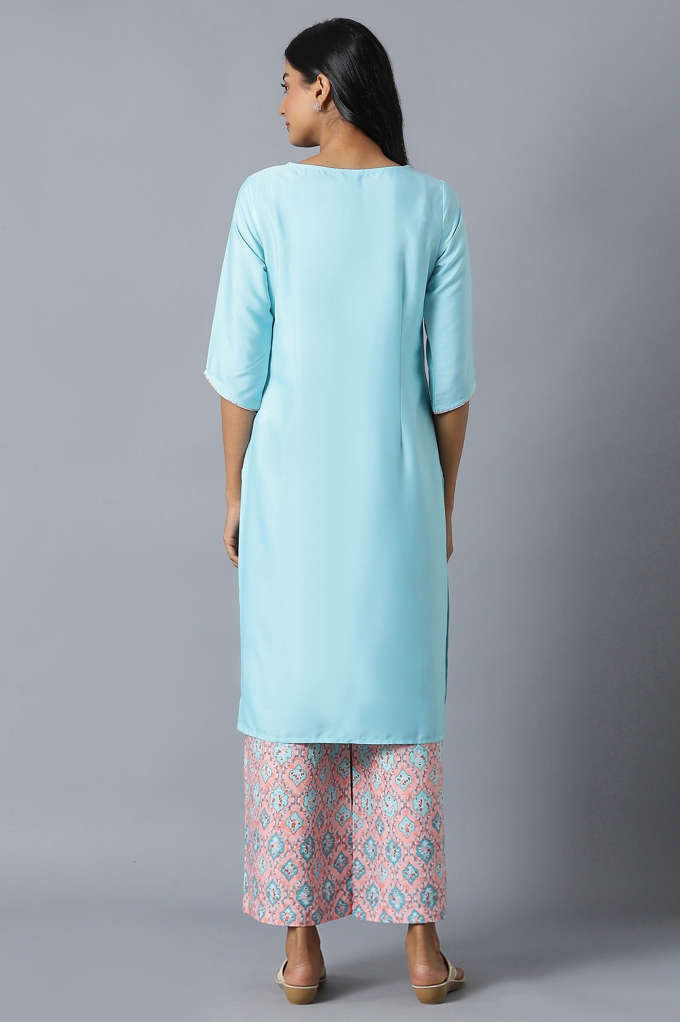 Revamp your casual ethnic wear wardrobe by adding these modern set. The set includes a blue straight fit kurta having thread embroidery on yoke and orange printed straight palazzo pants.