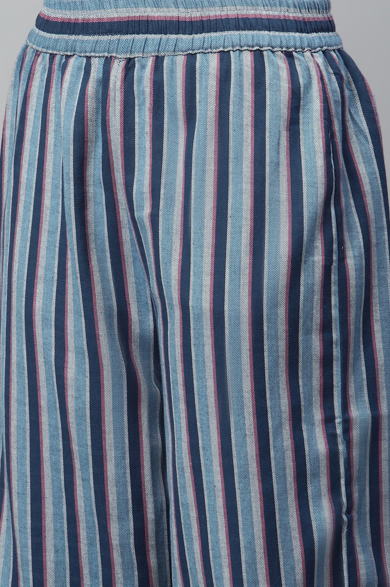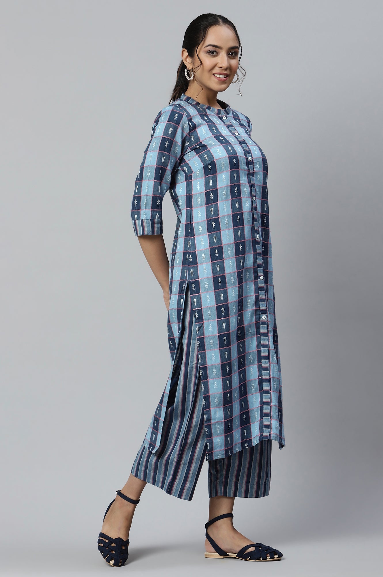 Ease into this co-ord set that encompasses a smart color-blocked checks dobby kurta and a striped straight culotte. Complimented with fine details like a striped placket and a mandarin collar, it will certainly be a refreshing addition to your wardrobe.