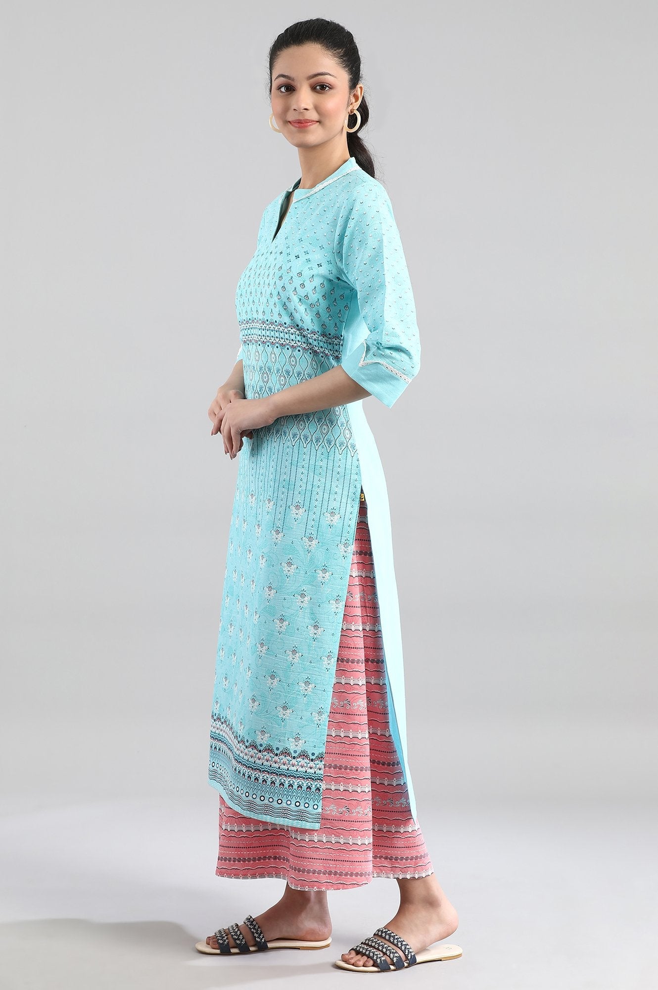 Plume blue printed straight kurta in band with V collar and regular three-quarter sleeves.