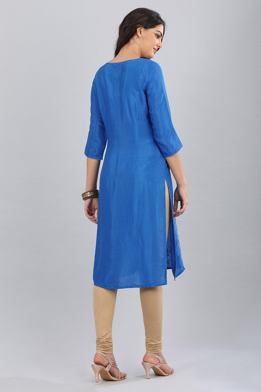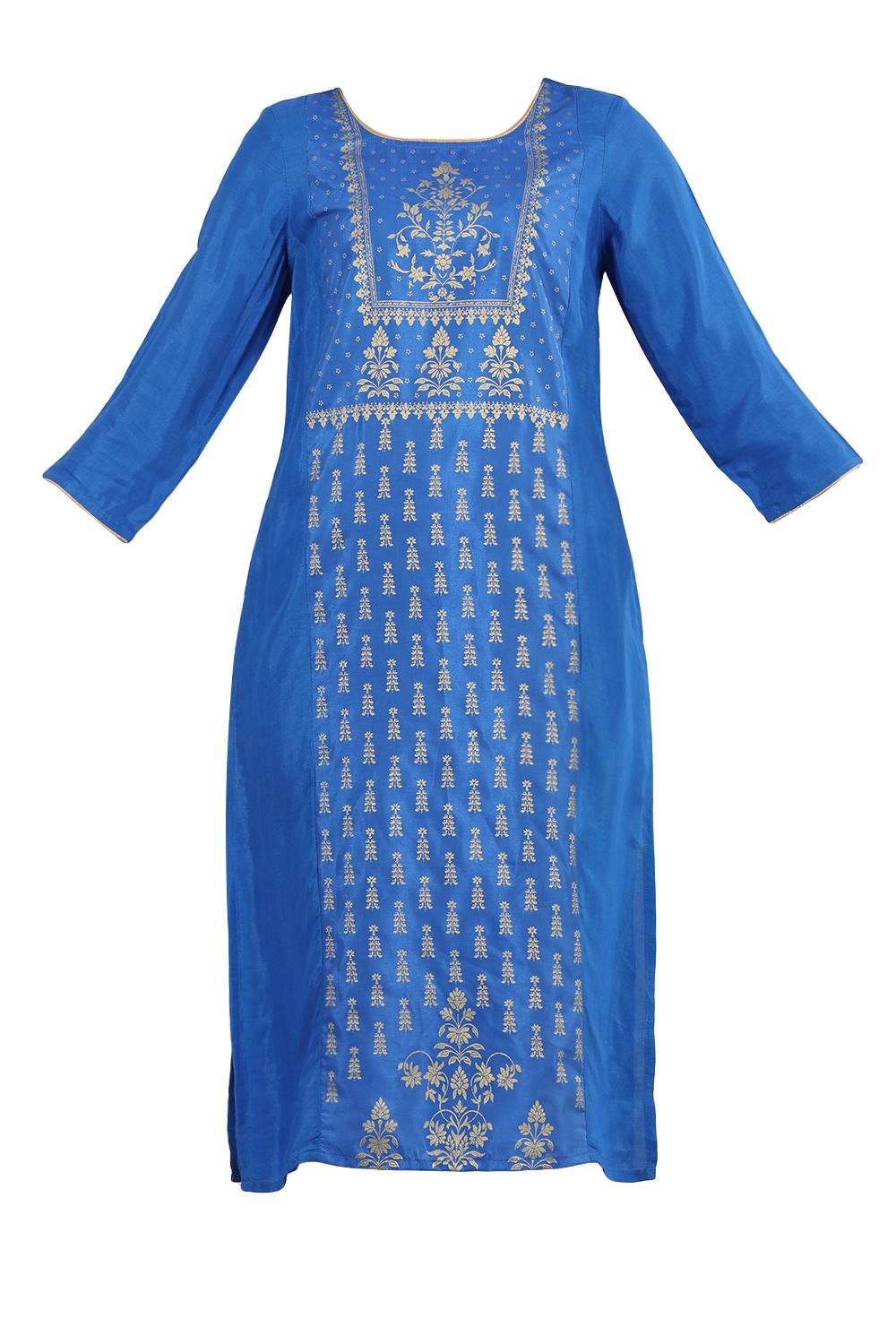Blue round neck 3/4 sleeve kurta with printed detail.